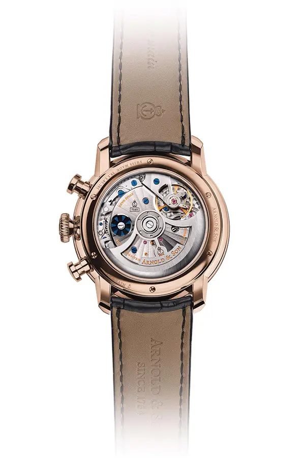 Das silberne Zifferblatt beherbergt eine Chronographenfunktion, die die Präzisionsphilosophie der Marke eindrucksvoll widerspiegelt. Durch das Saphirglas lässt sich das meisterhaft veredelte Innenleben bewundern. Im Inneren arbeitet das Kaliber A&S7103, ein mechanisches Automatikwerk mit einer Gangreserve von ca. 50 Stunden, 28.800 Halbschwingungen pro Stunde (4Hz) und 31 Lagersteinen.