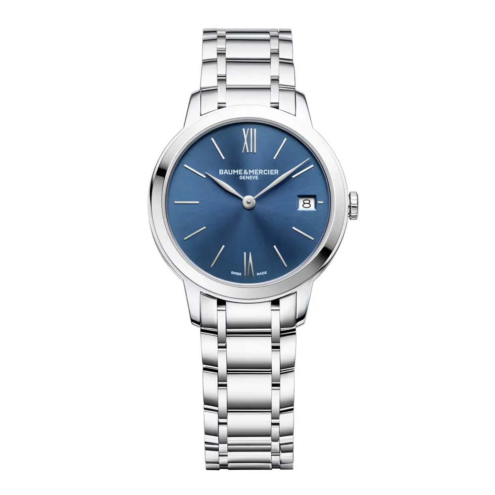Die Baume & Mercier Classima Lady M0A10477 vereint weibliche Eleganz und Schweizer Präzision. Das 31 mm Edelstahlgehäuse umrahmt ein blaues, sonnensatiniertes Zifferblatt mit römischen Ziffern und einem Datumsfenster bei 3 Uhr, das den eleganten und zugleich modernen Charakter der Classima-Kollektion verkörpert.