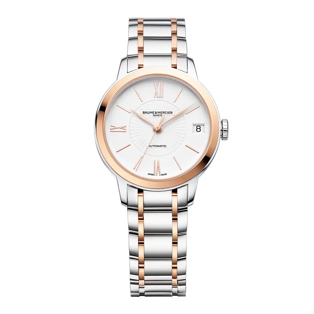 Die Baume & Mercier Classima M0A10269 verkörpert zeitlose Eleganz und feminine Raffinesse. Das 31 mm Edelstahlgehäuse wird durch eine Lünette aus 18 kt Roségold ergänzt, die einen edlen Zwei-Farb-Kontrast schafft. Das weiße Guilloché-Zifferblatt mit goldenen römischen Ziffern spiegelt den klassischen Charakter der Classima-Kollektion wider, während das Datumsfenster bei 3 Uhr praktische Funktionalität bietet.