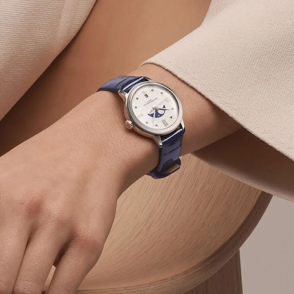 Saphirglas schützt das Zifferblatt vor Kratzern, während die Wasserdichtigkeit bis 50 m (5 ATM) die Alltagstauglichkeit gewährleistet. Das blaue Alligatorlederarmband mit polierter Schließe harmoniert perfekt mit dem Edelstahlgehäuse und betont den femininen Charakter der Uhr.