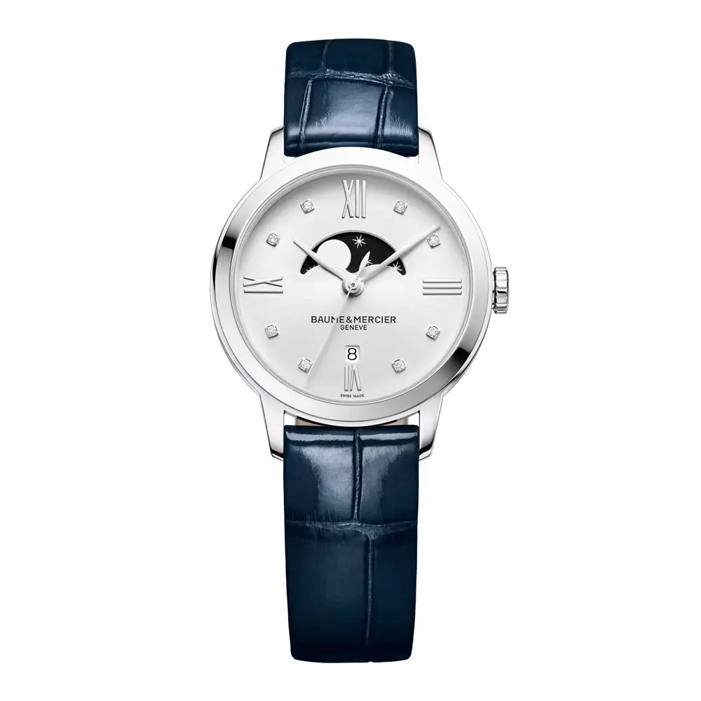 Die Baume & Mercier Classima M0A10329 verkörpert weibliche Eleganz und traditionelle Uhrmacherkunst. Das 31 mm Edelstahlgehäuse umrahmt ein silberfarbenes Zifferblatt mit acht Diamantindizes und römischen Ziffern, die einen dezenten, eleganten Kontrast bilden. Bei 6 Uhr befindet sich eine Mondphasenanzeige und ein Datumsfenster, die dem Modell einen Hauch klassischer Raffinesse verleihen.