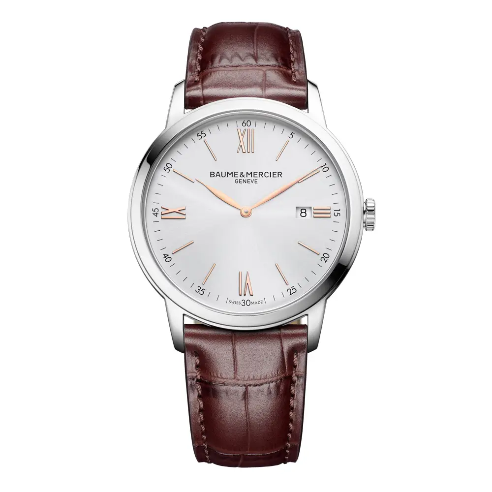 Die Baume & Mercier Classima M0A10415 verkörpert zeitlose Eleganz und Schweizer Präzision. Das 42 mm polierte Edelstahlgehäuse umrahmt ein silberfarbenes Zifferblatt mit Sonnenschliff, römischen Ziffern und vergoldeten Zeigern, die dem Modell einen klassischen und harmonischen Charakter verleihen. Das braune Kalbslederarmband betont seine warme Ausstrahlung und Vielseitigkeit.