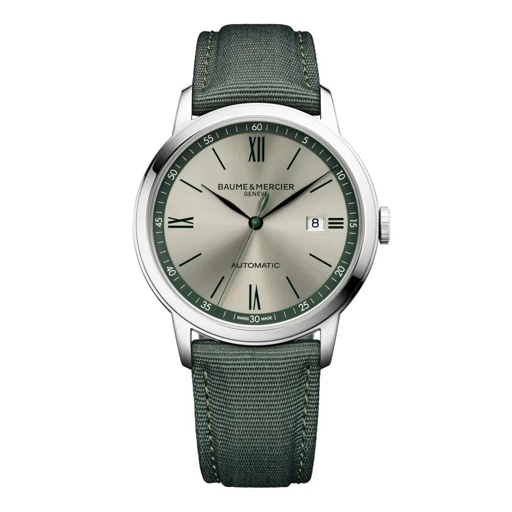 Das graue Zifferblatt ist mit feinen Indizes und römischen Ziffern bei 12, 3, 6 und 9 Uhr verziert, was einen klassischen und sauberen Eindruck vermittelt. Subtile grüne Akzente am Rand des Zifferblatts verleihen der Uhr einen modernen Touch und harmonieren perfekt mit dem olivgrünen Textilarmband, das gleichzeitig bequem und stilvoll ist. Bei 3 Uhr befindet sich eine praktische Datumsanzeige.