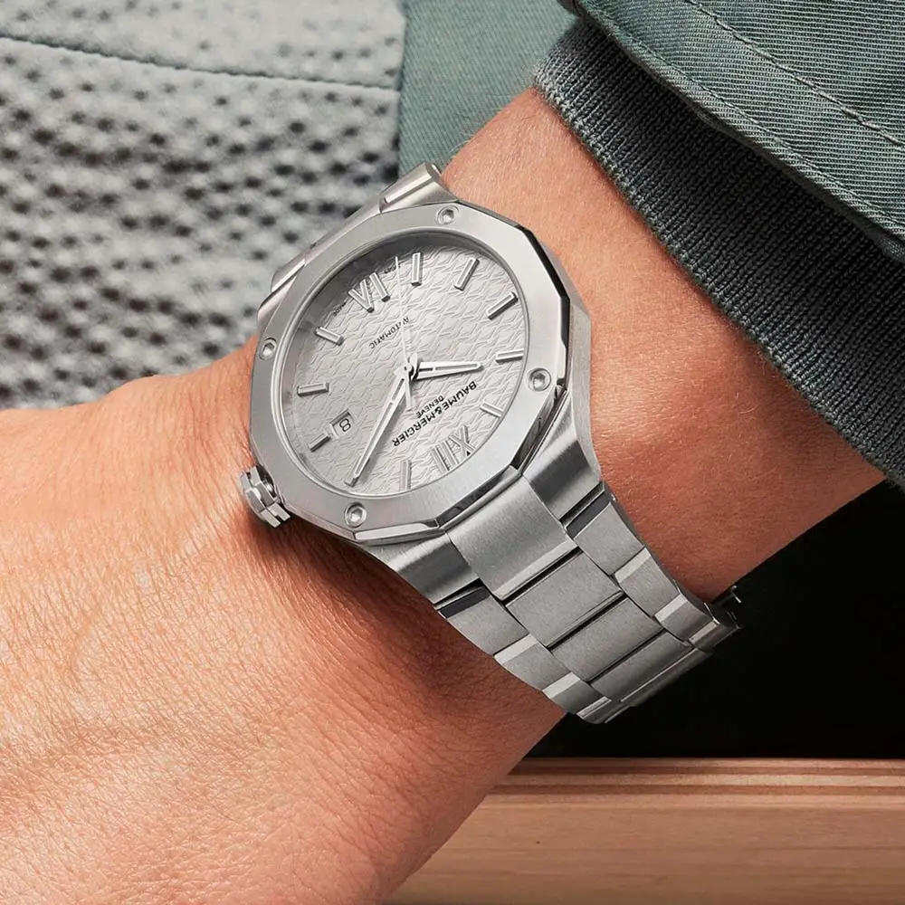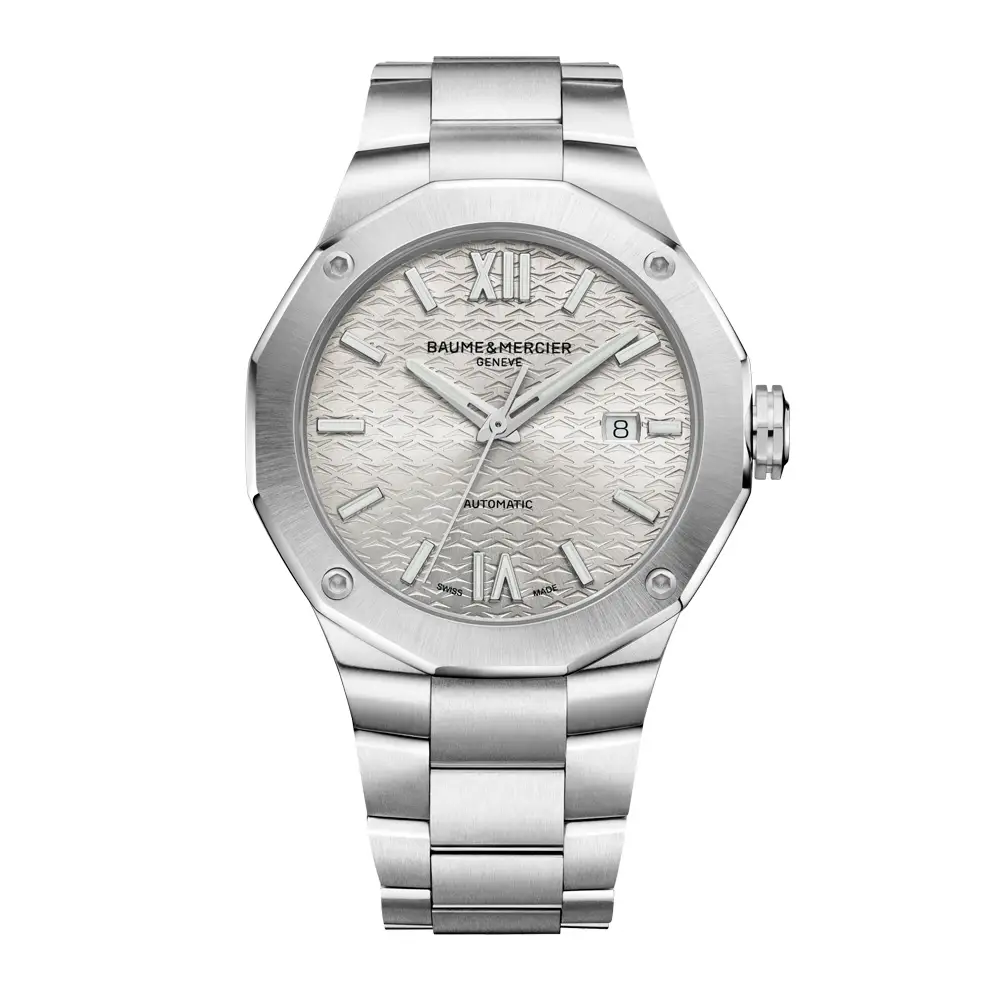 Die Baume & Mercier Riviera M0A10622 vereint sportliche Eleganz mit dem charakteristischen Design dieser ikonischen Kollektion. Das 42 mm polierte Edelstahlgehäuse wird durch die markante zwölfeckige Lünette mit vier Schrauben ergänzt, die der Uhr einen technischen und dynamischen Ausdruck verleiht. Das silberfarbene Sun-Satin-Zifferblatt harmoniert mit den rhodinierten Zeigern und einem Datumsfenster bei 3 Uhr.