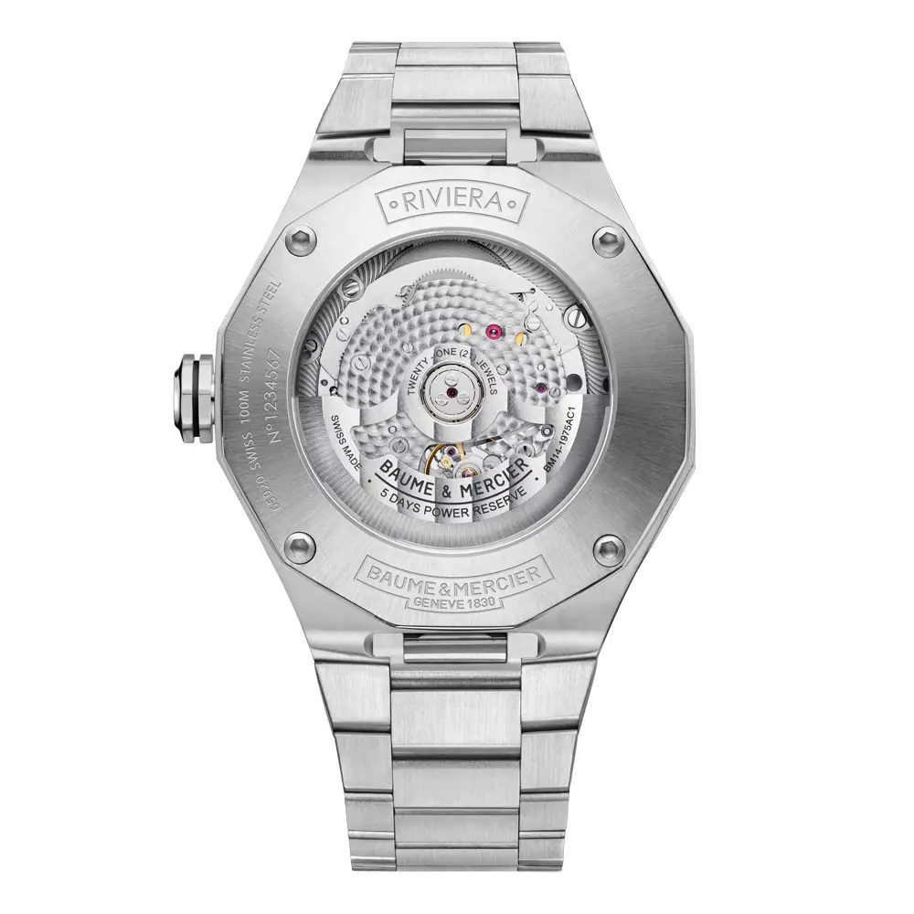 Die Baume & Mercier Riviera M0A10682 vereint sportlichen Charakter, technische Präzision und zeitlose Eleganz. Dieses Modell aus der ikonischen Riviera-Kollektion besticht durch ein zwölfeckiges Edelstahlgehäuse mit 43 mm Durchmesser, das für einen markanten und modernen Look sorgt. Das integrierte Edelstahlarmband unterstreicht den luxuriösen Stil und bietet hohen Tragekomfort sowie Robustheit.