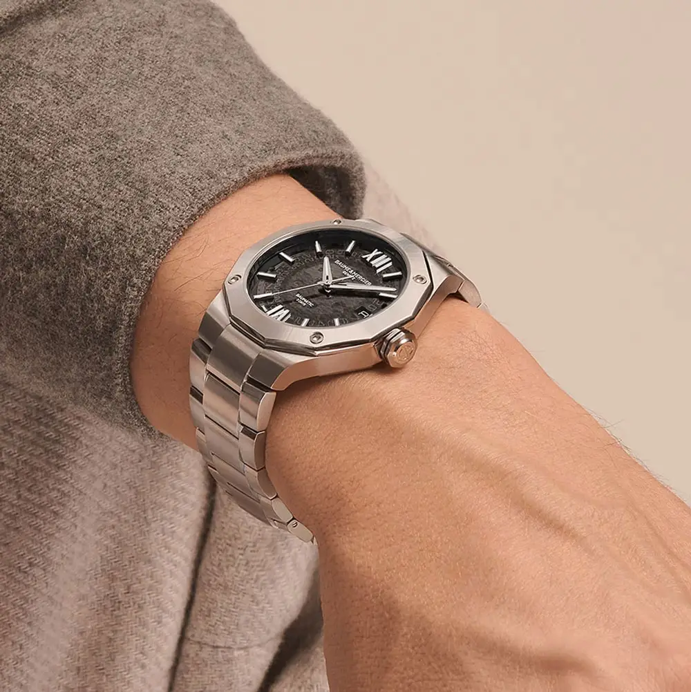 Das charakteristische runde 42-mm-Gehäuse aus Edelstahl wird durch die markante zwölfeckige Lünette ergänzt und verleiht der Uhr ihren unverwechselbaren Look. Saphirglas schützt das elegante schwarze analoge Zifferblatt, das eine klare Zeitanzeige und ein diskretes Datumsfenster bei 3 Uhr bietet.