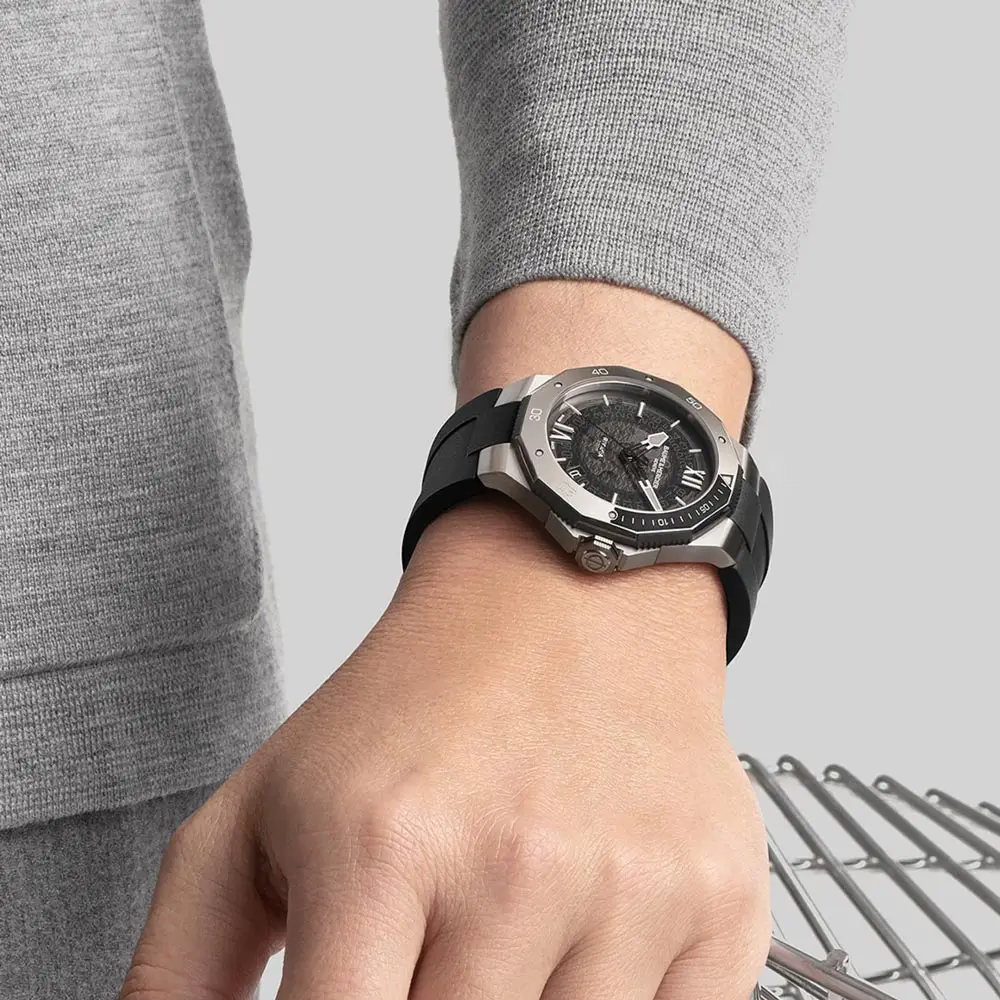 Das massive 42-mm-Gehäuse aus Edelstahl mit der typischen zwölfeckigen Lünette unterstreicht den dynamischen und modernen Look der Uhr. Saphirglas schützt vor Kratzern und gewährleistet perfekte Ablesbarkeit. Das übersichtliche analoge Skeleton-Zifferblatt wird durch ein praktisches Datumsfenster bei 3 Uhr ergänzt.