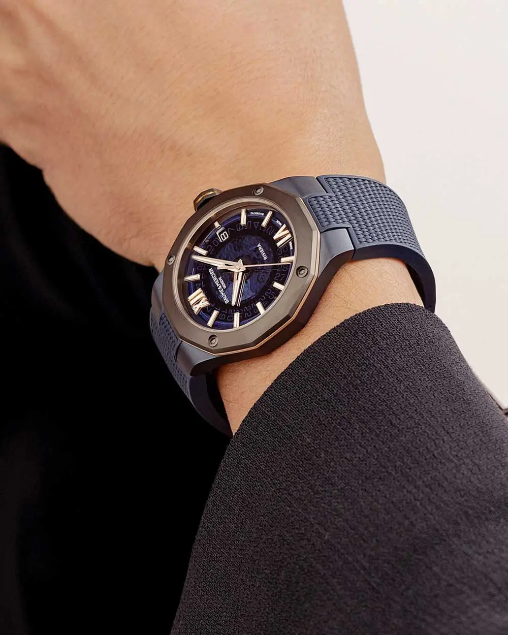 Die Baume & Mercier Riviera M0A10769 verkörpert moderne sportliche Eleganz mit einem technischen Charakter. Das 42 mm polierte Edelstahlgehäuse wird durch eine gebürstete Titanlünette ergänzt, die der Uhr ein edles und leichtes Erscheinungsbild verleiht. Das blaue, fein strukturierte Zifferblatt erinnert an die Tiefe des Meeres und spiegelt den Geist der Riviera-Kollektion wider.