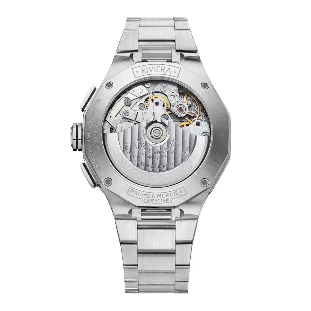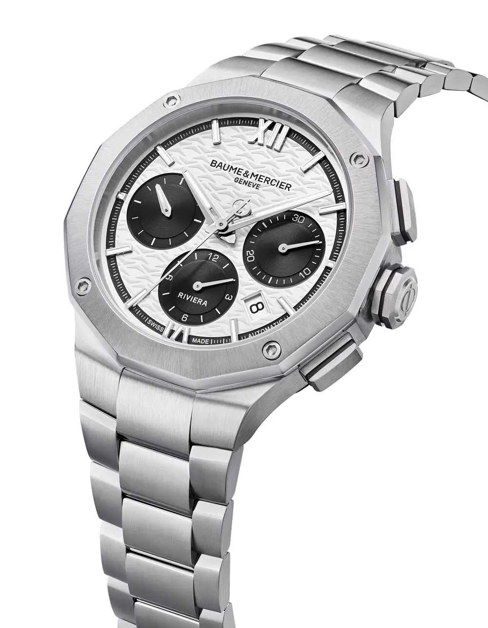 Die Baume & Mercier Riviera M0A10827 ist eine moderne Neuinterpretation des kultigen sportlichen Designs aus den 1970er Jahren. Die Riviera-Kollektion ist bekannt für ihr charakteristisches zwölfeckiges Gehäuse, das in diesem Design dank der Kombination edler Materialien und eines markanten Zifferblatts sowohl einen eleganten als auch sportlichen Ausdruck erhält.