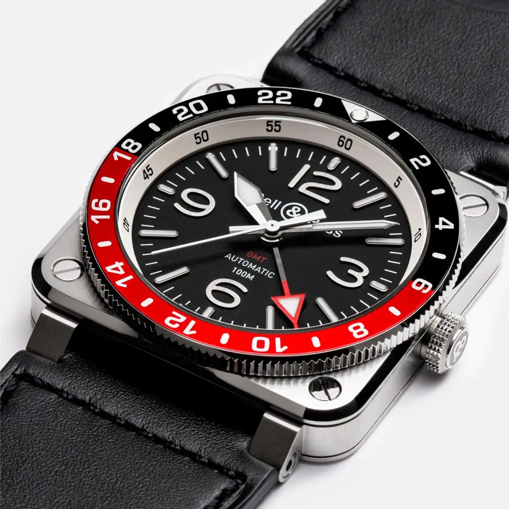Das 42 mm große, quadratische Edelstahlgehäuse bietet Robustheit und Charakter. Das schwarze Zifferblatt mit leuchtenden Zeigern und Indizes sorgt für exzellente Ablesbarkeit, während die drehbare Lünette aus Stahl und Aluminium das Ablesen einer zweiten Zeitzone durch den markanten roten GMT-Zeiger erleichtert.