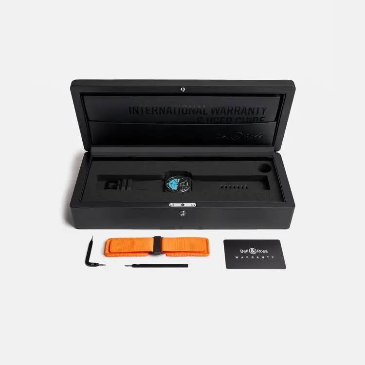 Im Inneren arbeitet das Automatikwerk BR-CAL.302 mit 54 Stunden Gangreserve, kombiniert mit einem schwarzen Kautschukarmband mit Dornschließe. Mit Wasserdichtigkeit bis 100 m (10 bar) steht die BR 03 Horizon für Flugzeuginspiration, technische Exzellenz und modernen Purismus, wie ihn Bell & Ross verkörpert.