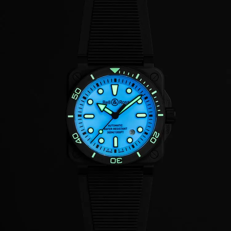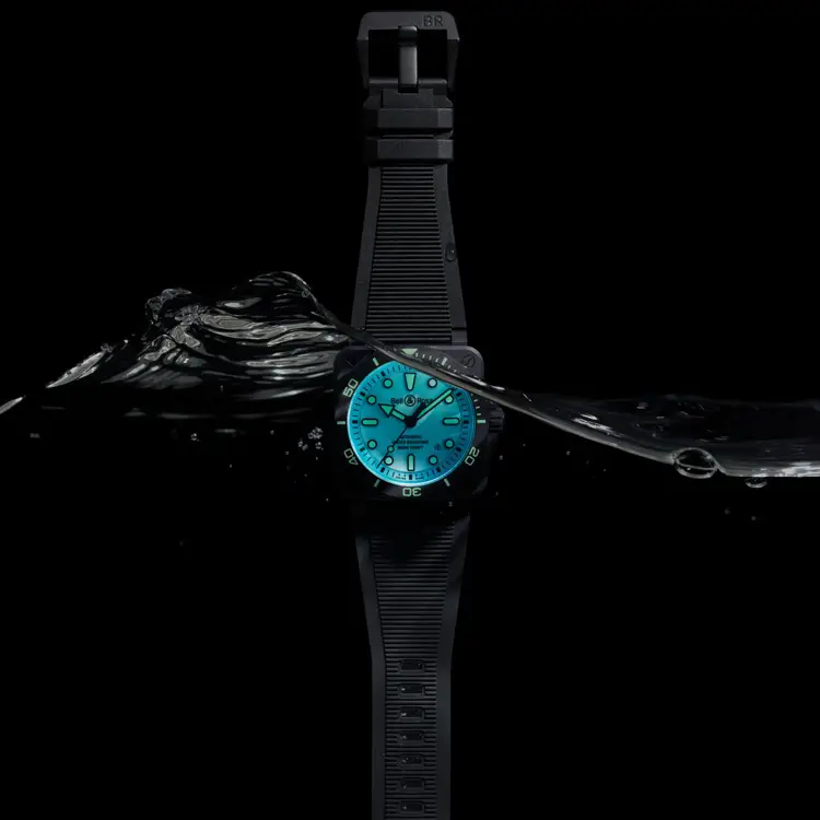 Die Bell & Ross BR 03 Diver Full Lum Ceramic vereint professionelle Funktionalität, technische Innovation und modernes Design in perfekter Harmonie. Durch das vollständig leuchtende Zifferblatt bleibt die Uhr selbst in absoluter Dunkelheit perfekt ablesbar – ideal für Nachttauchgänge und Abenteuer unter Wasser.