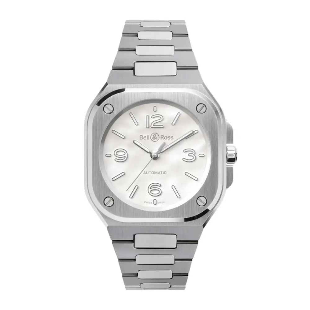 Die Bell & Ross BR 05 & Ross BR 05 36mm Perlmuttstahl (BR05A-S-MP-ST/SST) ist eine Verschmelzung von technischem Design und femininer Eleganz. Ihr kompaktes 36-mm-Gehäuse aus poliertem und gebürstetem Edelstahl bleibt dem ikonischen Stil der BR 05 treu, mit einem integrierten Armband und einer quadratischen Form mit abgerundeten Ecken, die von Luftfahrtinstrumenten inspiriert ist.