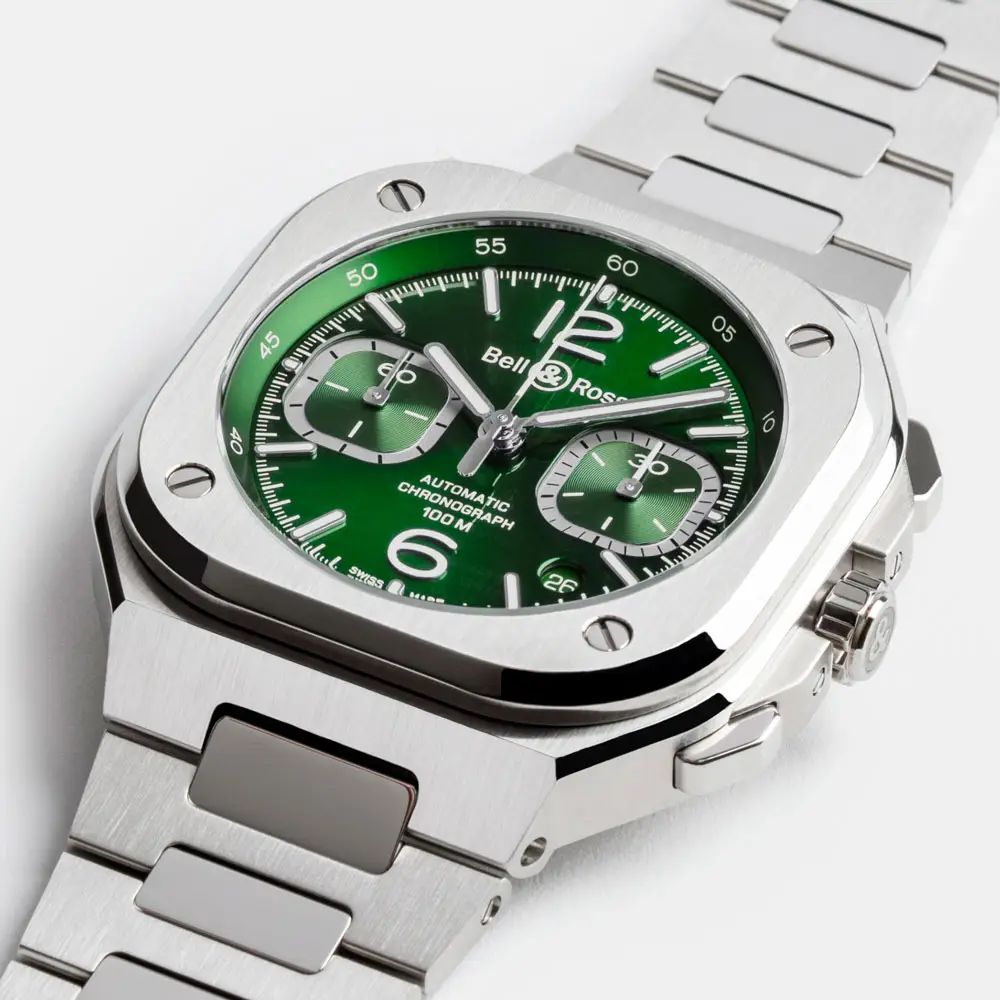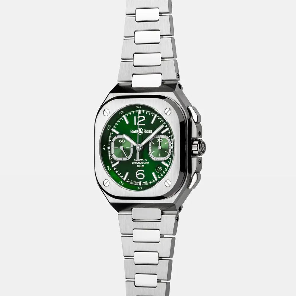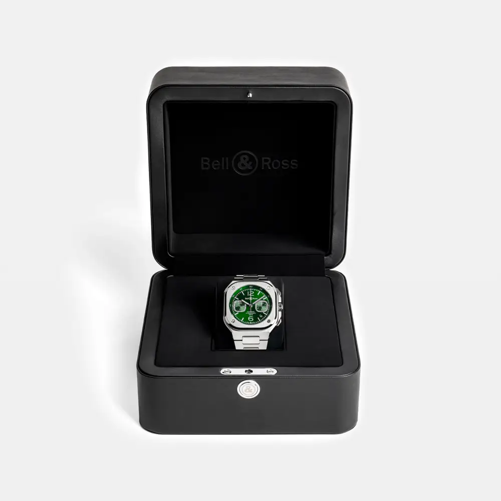 Die Bell & Ross BR 05 Chrono Green Steel vereint frische Energie, selbstbewusstes Design und technische Präzision in einem Modell. Dieser Chronograph wurde für den modernen Mann entwickelt, der Leistung und Stil gleichermaßen schätzt – perfekt für den urbanen Lebensstil.
