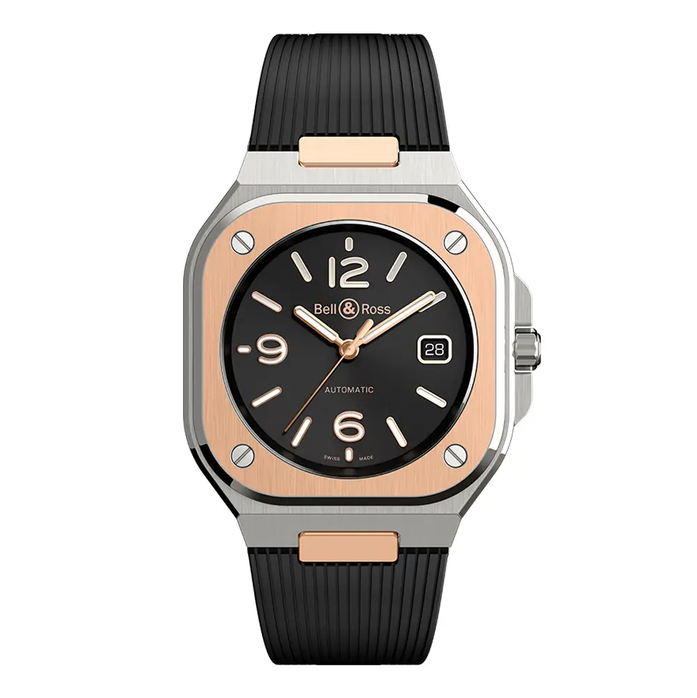 Die Bell & Ross BR 05 Black Steel & Gold vereint kraftvolle Ästhetik mit luxuriösem Stil und kombiniert Edelstahl mit einer edlen 18-karätigen Roségold-Lünette. Dieses Modell aus der BR 05 Kollektion richtet sich an den modernen Mann, der technische Präzision und Eleganz schätzt.