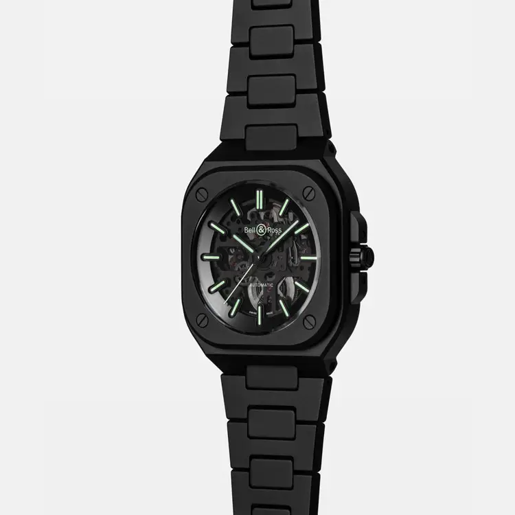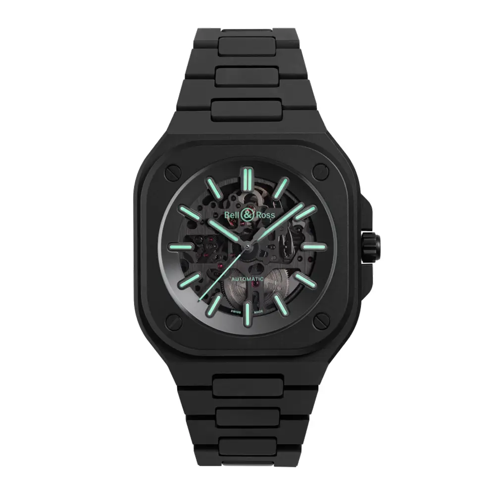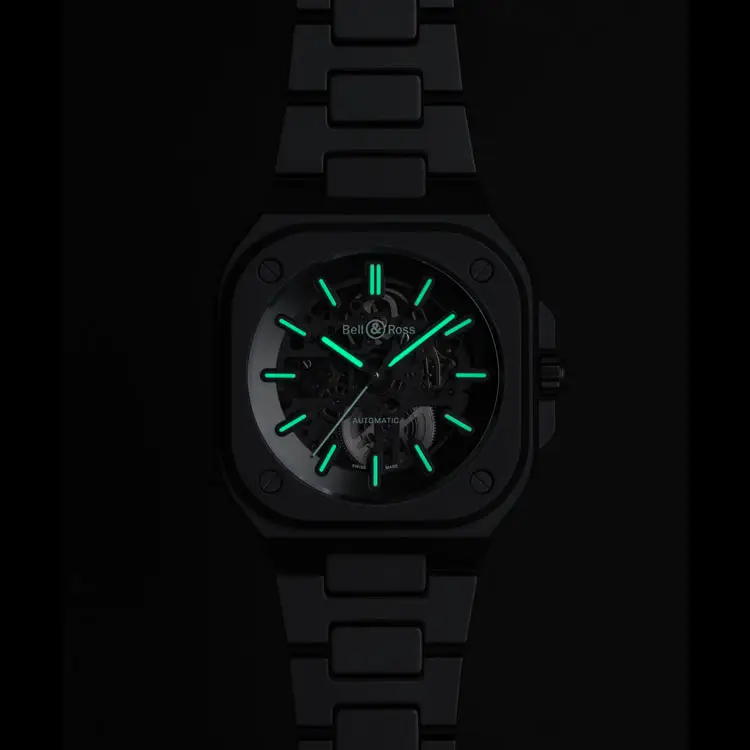 Die Bell & Ross BR 05 Skeleton Black Lum Ceramic vereint futuristisches Design, Hightech-Materialien und perfekte Ablesbarkeit bei Tag und Nacht. Der skelettierte Zifferblattaufbau mit leuchtenden Elementen und das mattschwarze Keramikgehäuse machen sie zu einer technischen und ästhetischen Meisterleistung.