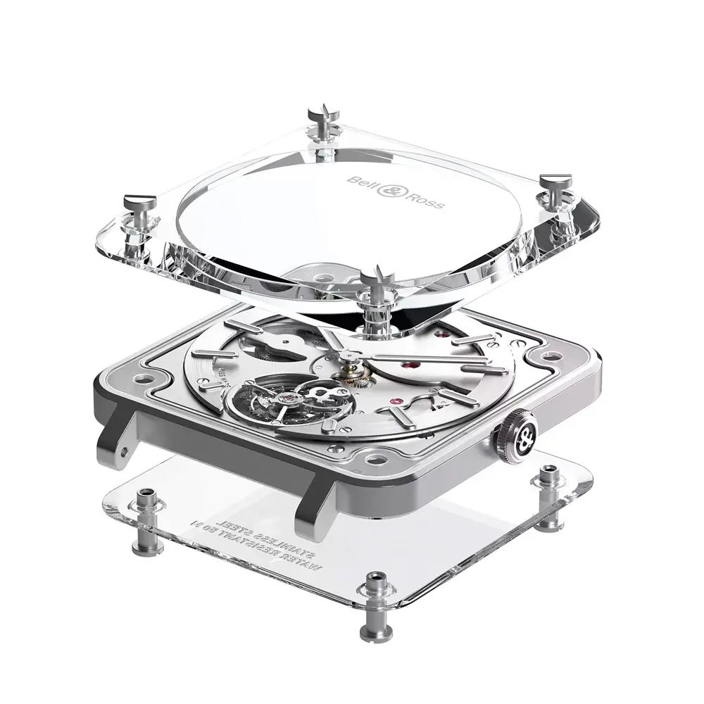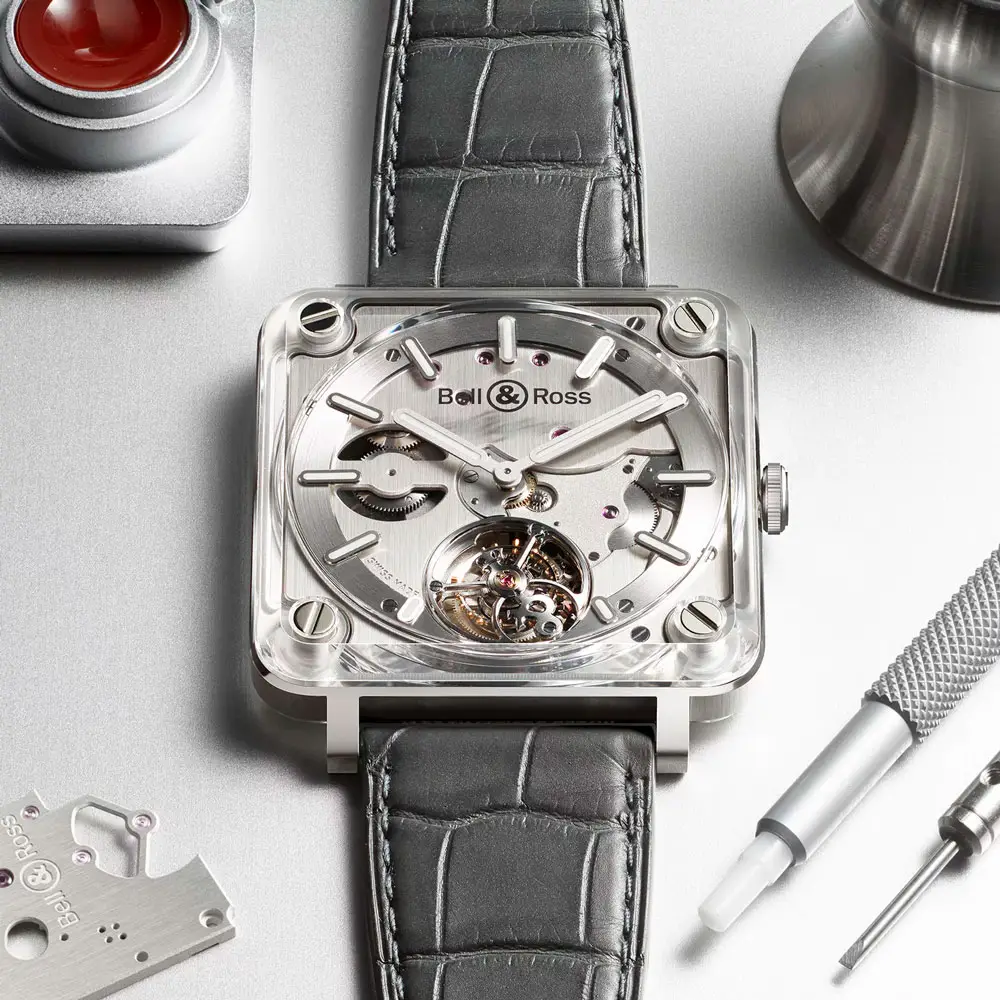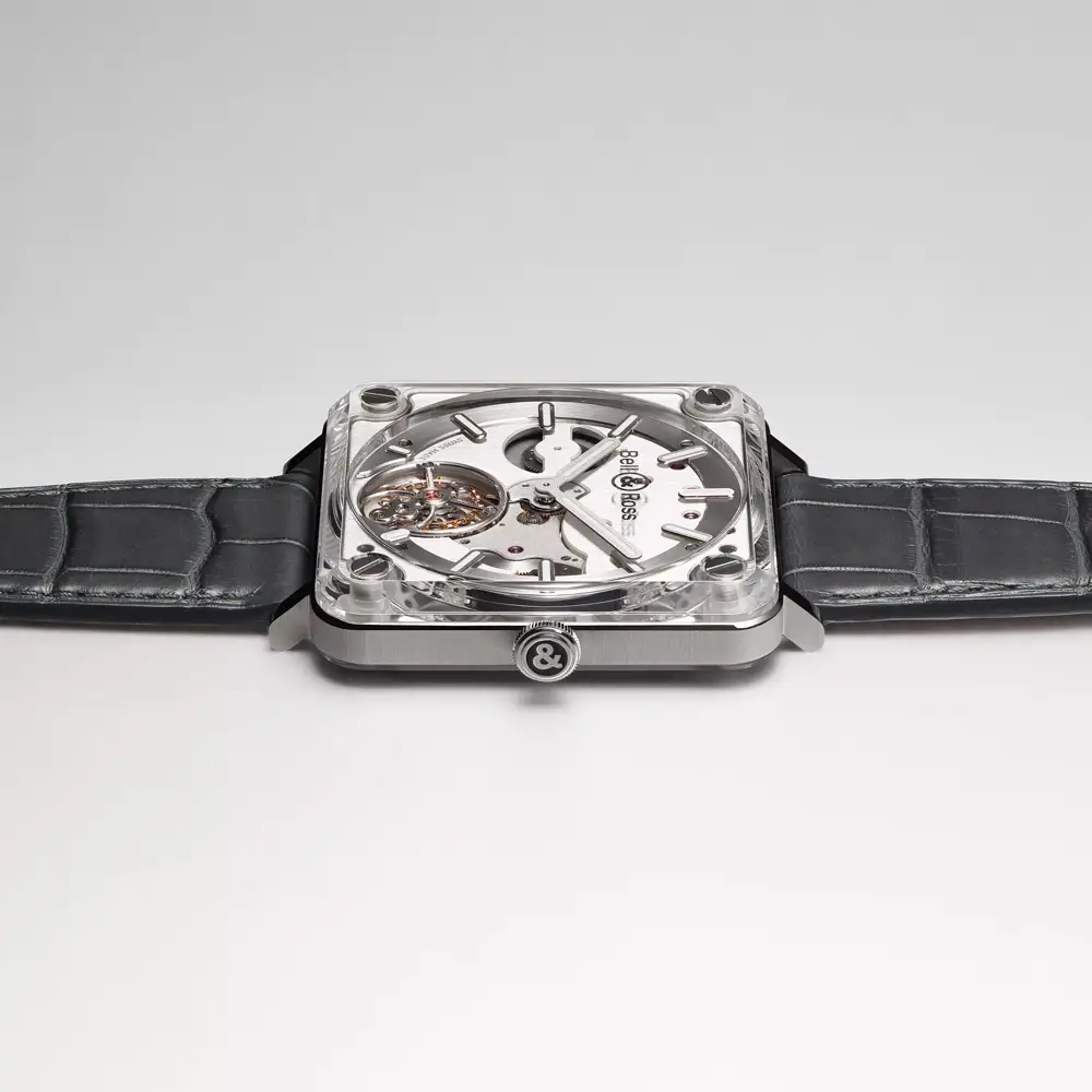 Die Bell & Ross BR-X2 Tourbillon Micro-Rotor BRX2-MRTB-ST verkörpert Innovation auf höchstem Niveau und avantgardistisches Design. Das 42,5 mm Gehäuse aus Edelstahl und Saphirglas erzeugt die Illusion, dass das Uhrwerk zwischen zwei Glasplatten schwebt, und bietet einen faszinierenden Blick auf die Komplikation und die Architektur der Uhr. Die transparente Konstruktion unterstreicht den modernen technischen Charakter dieses einzigartigen Zeitmessers.