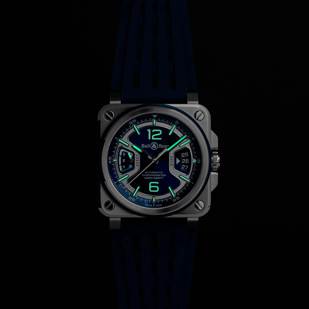 Die Bell & Ross BR-X3 Blue Steel ist eine moderne Interpretation des ikonischen quadratischen Designs der Marke. Das 41 mm Gehäuse aus Edelstahl wird durch eine blau eloxierte Lünette und architektonische Details ergänzt, die den technischen Charakter der Uhr unterstreichen. Ein Saphirglas mit Antireflexbeschichtung sorgt für perfekte Ablesbarkeit unter allen Bedingungen.