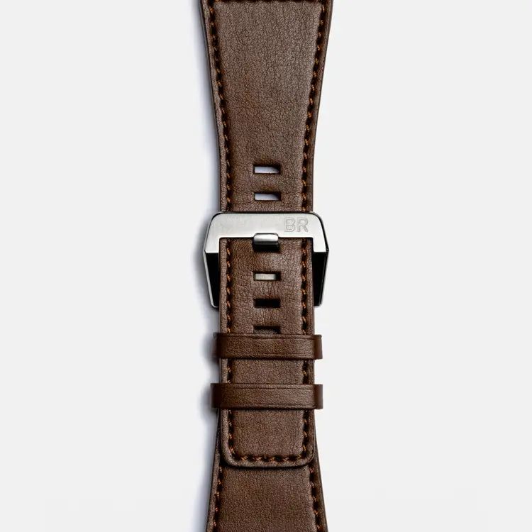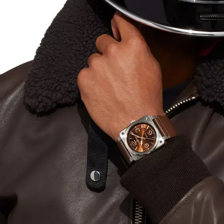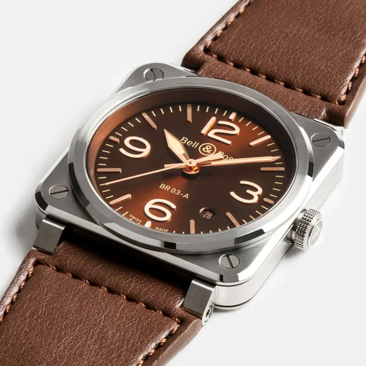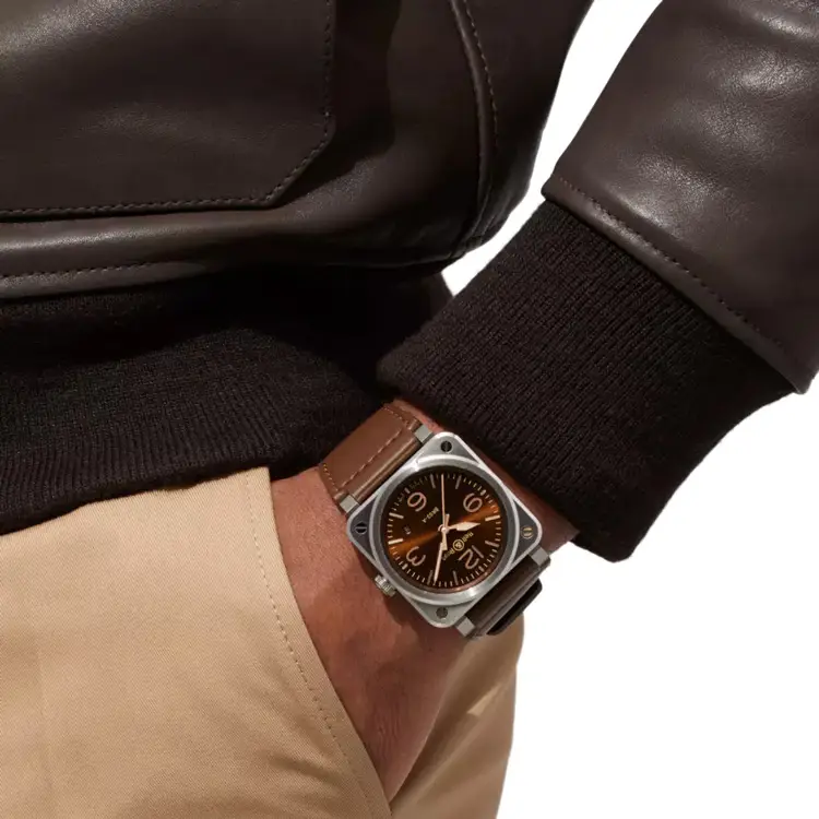 Das 41 mm große quadratische Gehäuse aus Edelstahl verleiht der Uhr das ikonische Bell & Ross-Design. Saphirglas mit Antireflexbeschichtung schützt das braune Zifferblatt, auf dem goldene Zeiger und Indizes mit Leuchtbeschichtung auch bei Dunkelheit gut ablesbar sind.