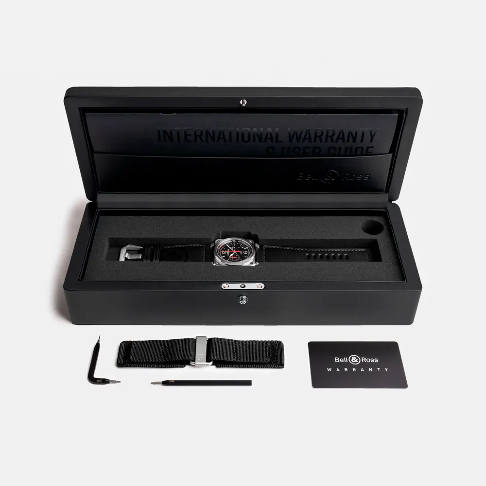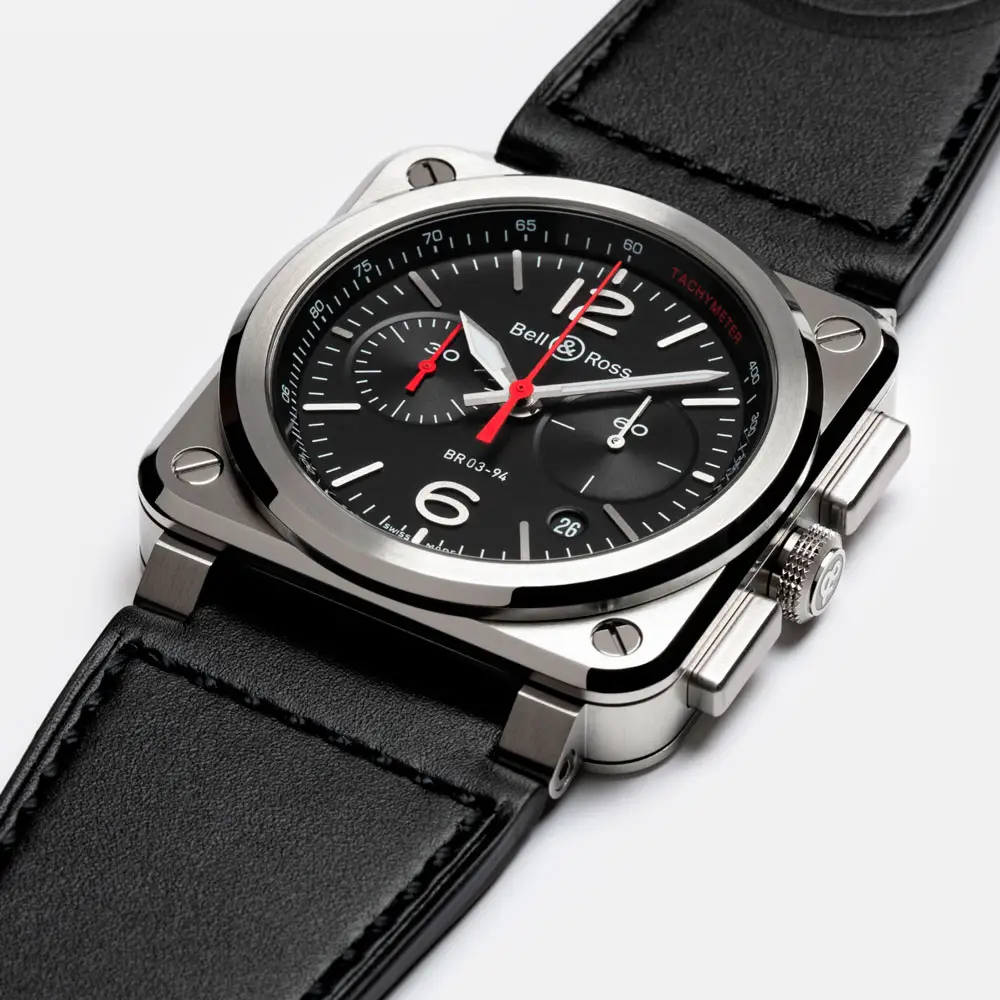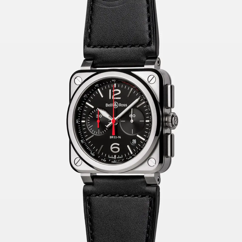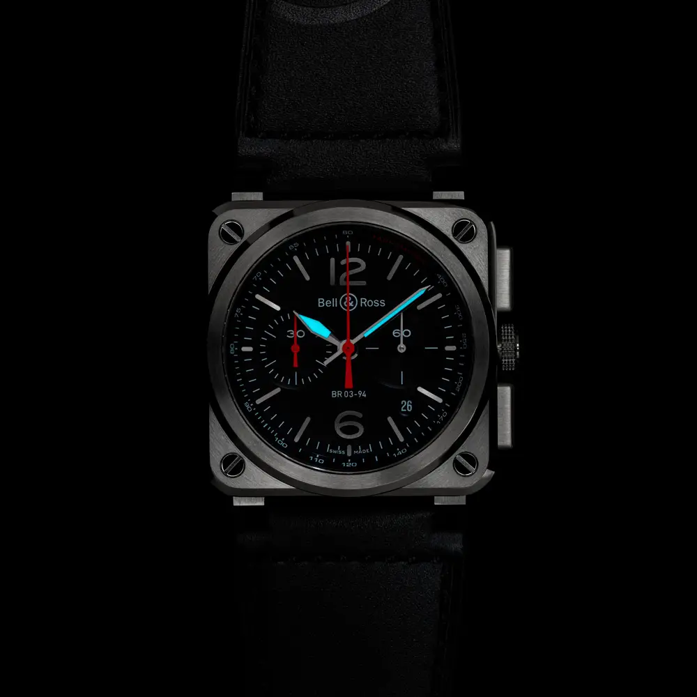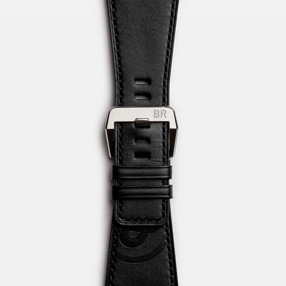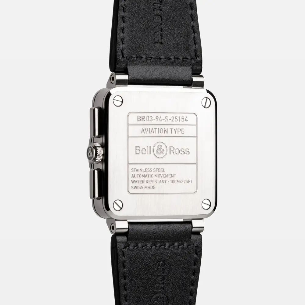 Im Inneren arbeitet das automatische Kaliber BR-CAL.301 mit Chronographen- und Datumsfunktion sowie einer Gangreserve von etwa 42 Stunden. Mit 100 m (10 ATM) Wasserdichtigkeit und einem schwarzen Lederarmband mit Dornschließe verkörpert die BR 03-94 Black Steel die perfekte Balance aus Eleganz, Leistung und Robustheit.