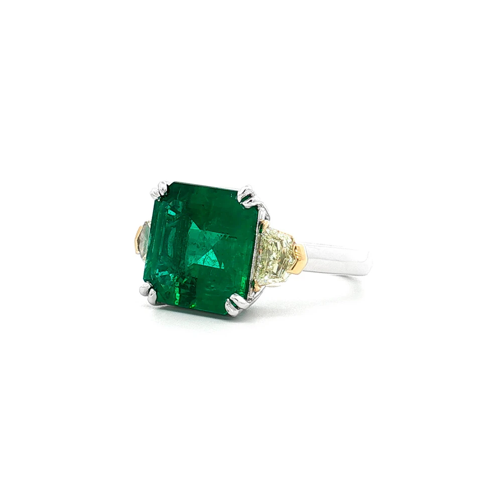 Dieser exklusive Ring ist aus Bicolor-Gold gefertigt und mit einem beeindruckenden Smaragd im Smaragdschliff von 5,85 ct besetzt, der sofort durch sein intensives Grün fasziniert. Der prachtvolle Edelstein symbolisiert Harmonie, Stärke und Ewigkeit und verleiht dem Schmuckstück seinen einzigartigen Charakter und seine Noblesse.
