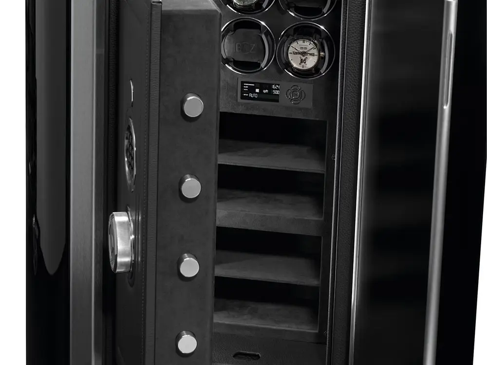 Der Tresor verfügt über eine VdS/ECB-S-Zertifizierung, die höchste Sicherheitsstandards garantiert. Das Innenleben ist meisterhaft verarbeitet - edle Polsterung, hochwertige Holz- und Lederelemente und vor allem eine intelligente LED-Beleuchtung, die beim Öffnen den gesamten Inhalt stilvoll beleuchtet. Integrierte Uhrenbeweger sind ebenfalls enthalten, so dass Ihre Luxusuhr immer bereit zum Tragen ist.