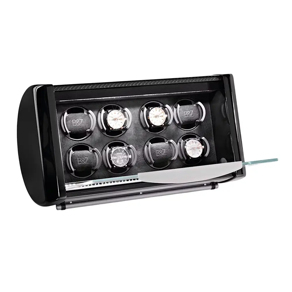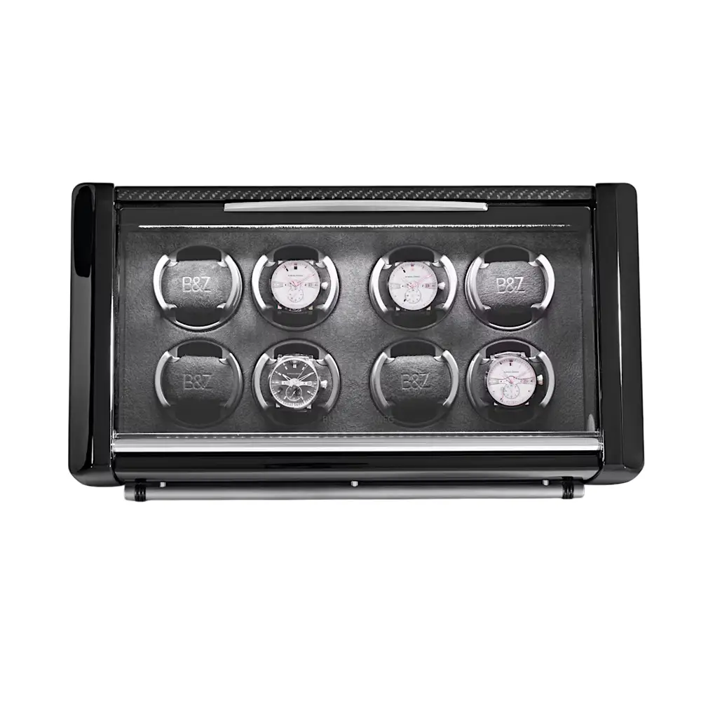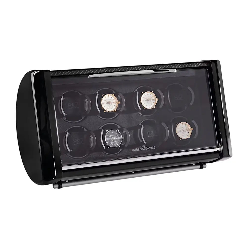 Der Buben & Zorweg SPIRIT 8 Uhrenbeweger vereint luxuriöses Design, technische Präzision und meisterhafte Handwerkskunst in Perfektion. Er bietet Platz für bis zu acht Automatikuhren und kombiniert ein elegantes Gehäuse aus gebürstetem Aluminium mit edlen Details aus Carbon, Croco-Leder oder Macassar-Holz. Die Frontscheibe aus Sicherheitsglas erlaubt einen freien Blick auf Ihre Sammlung, während das mit weichem Velours ausgekleidete Innere die Uhren zuverlässig schützt.