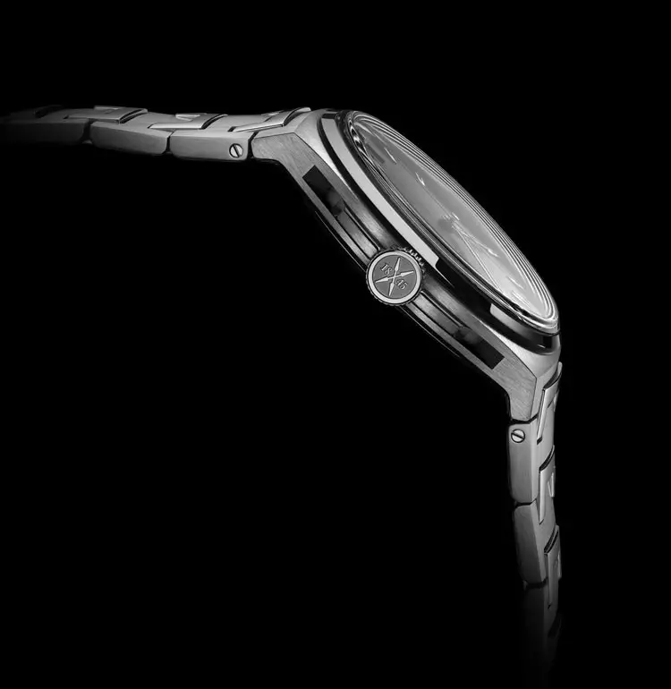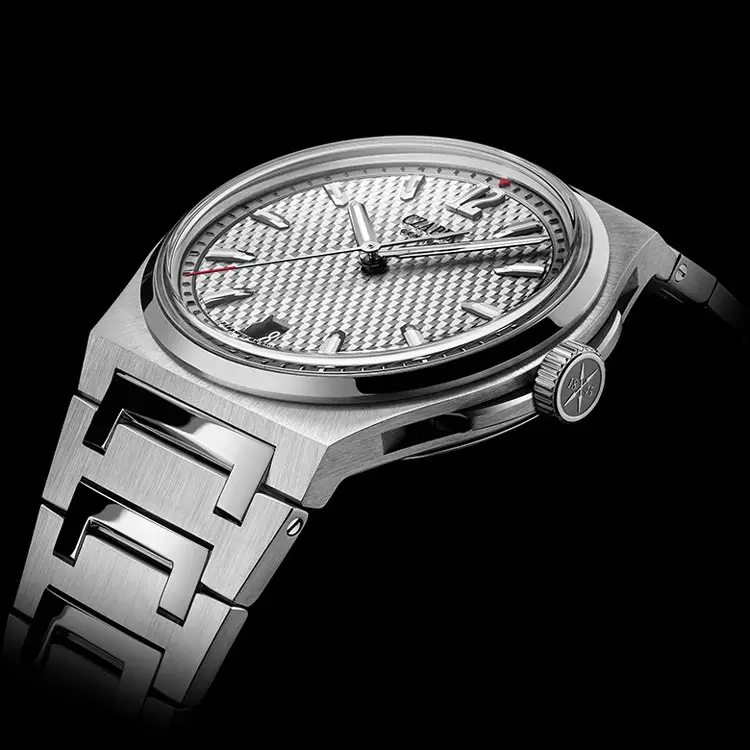 Das runde Edelstahlgehäuse mit 40,5 mm Durchmesser geht nahtlos in ein integriertes, silberfarbenes Edelstahlarmband über, das Komfort und ein modernes Aussehen bietet. Die Uhr verfügt über ein Saphirglas und eine hohe Wasserdichtigkeit von 12 ATM (120 Meter) – bereit für tägliche Abenteuer und Wassersport.