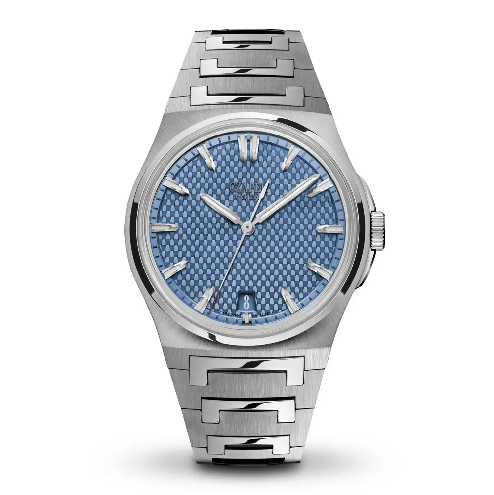 Das 40,5 mm Gehäuse aus poliertem und gebürstetem Edelstahl geht nahtlos in ein integriertes Edelstahlarmband über, dessen Glieder Komfort und zeitlose Eleganz garantieren. Das Highlight ist das atemberaubende „Glacier Blue“ Zifferblatt mit feiner horizontaler Struktur, inspiriert von den Gletscherspalten in der Drake Passage – dem Namensgeber des Modells.