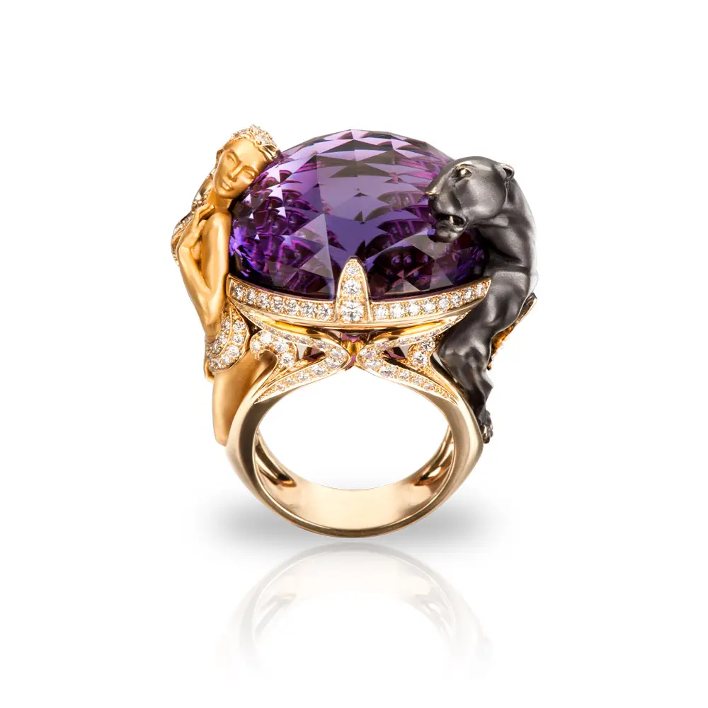 Der Ring ist mit 147 weißen Diamanten (gesamt 1,41 ct) besetzt, die einen intensiven Glanz erzeugen. Im Zentrum steht ein Amethyst mit 15,16 ct, der dem Schmuckstück Tiefe und Exklusivität verleiht.