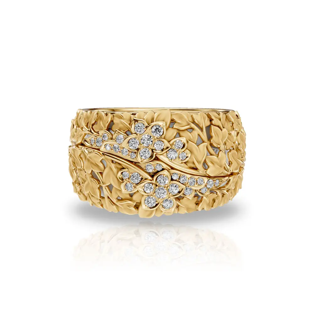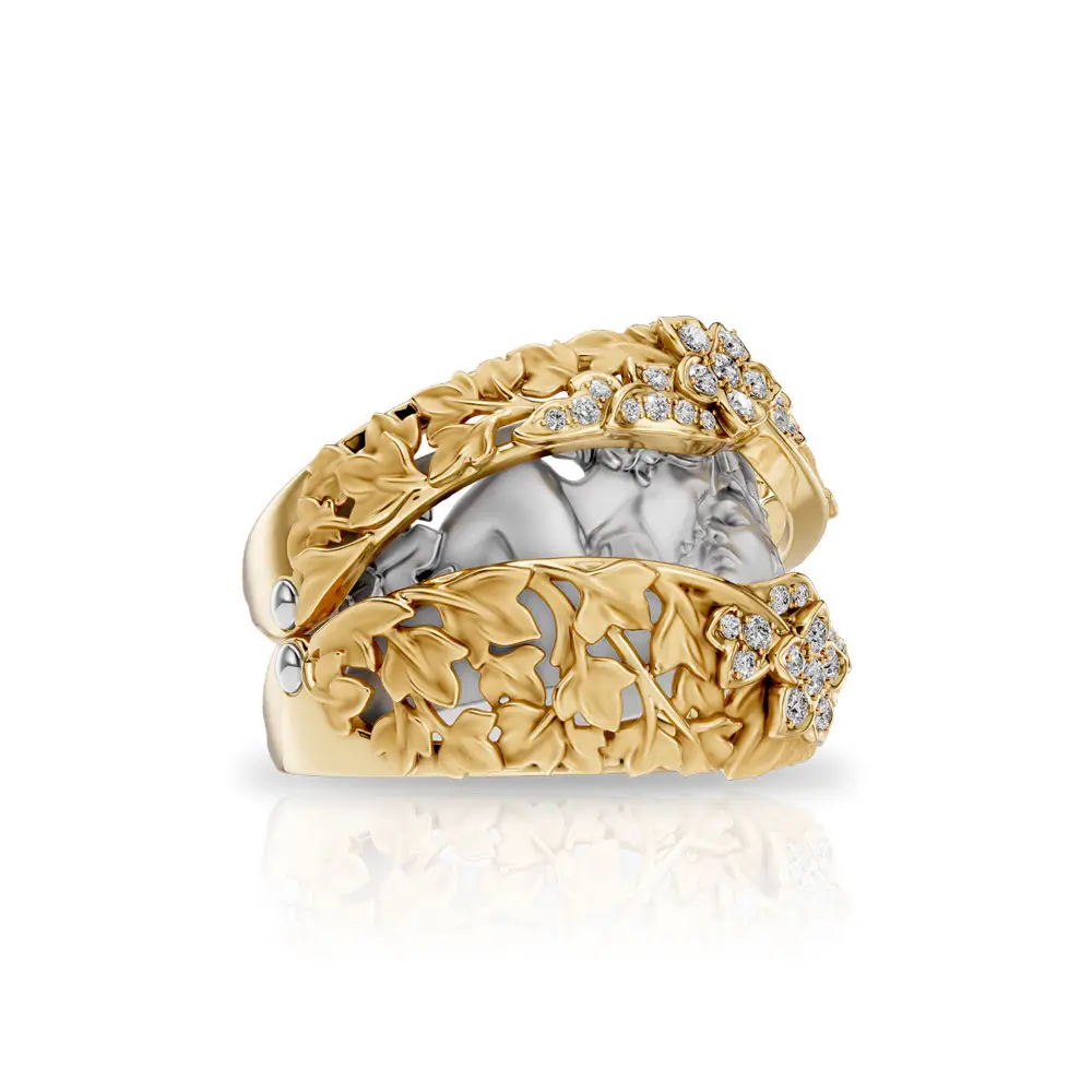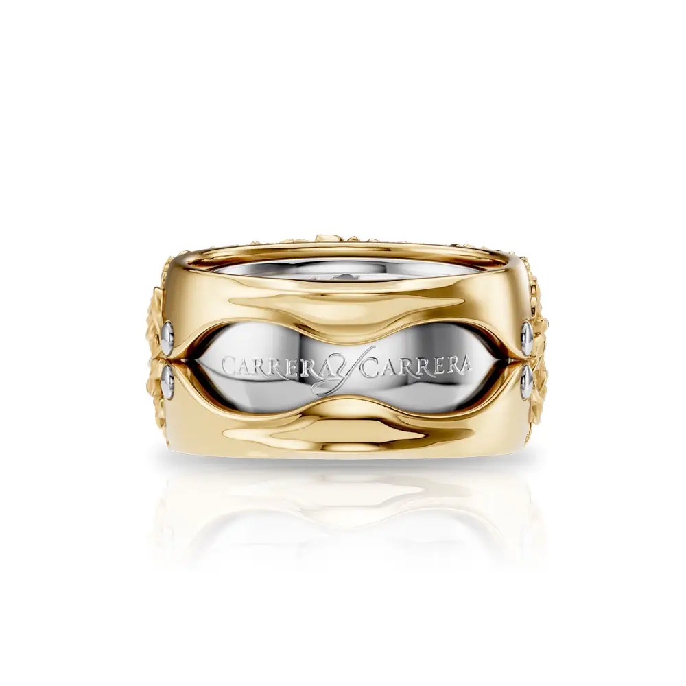 Carrera y Carrera Secret ist ein ikonischer Ring, der die Grenzen der traditionellen Schmuckherstellung überschreitet und sich in ein Kunstobjekt mit einer tiefen emotionalen Ladung verwandelt. Dieses außergewöhnliche Schmuckstück aus kombiniertem 18-karätigem Gold beeindruckt auf den ersten Blick durch sein reich strukturiertes florales Dekor in einem harmonischen Spiel aus Glanz und Matt, das durch das Funkeln von 36 präzisionsgefassten Diamanten mit einem Gesamtgewicht von 0,27 Karat akzentuiert wird .