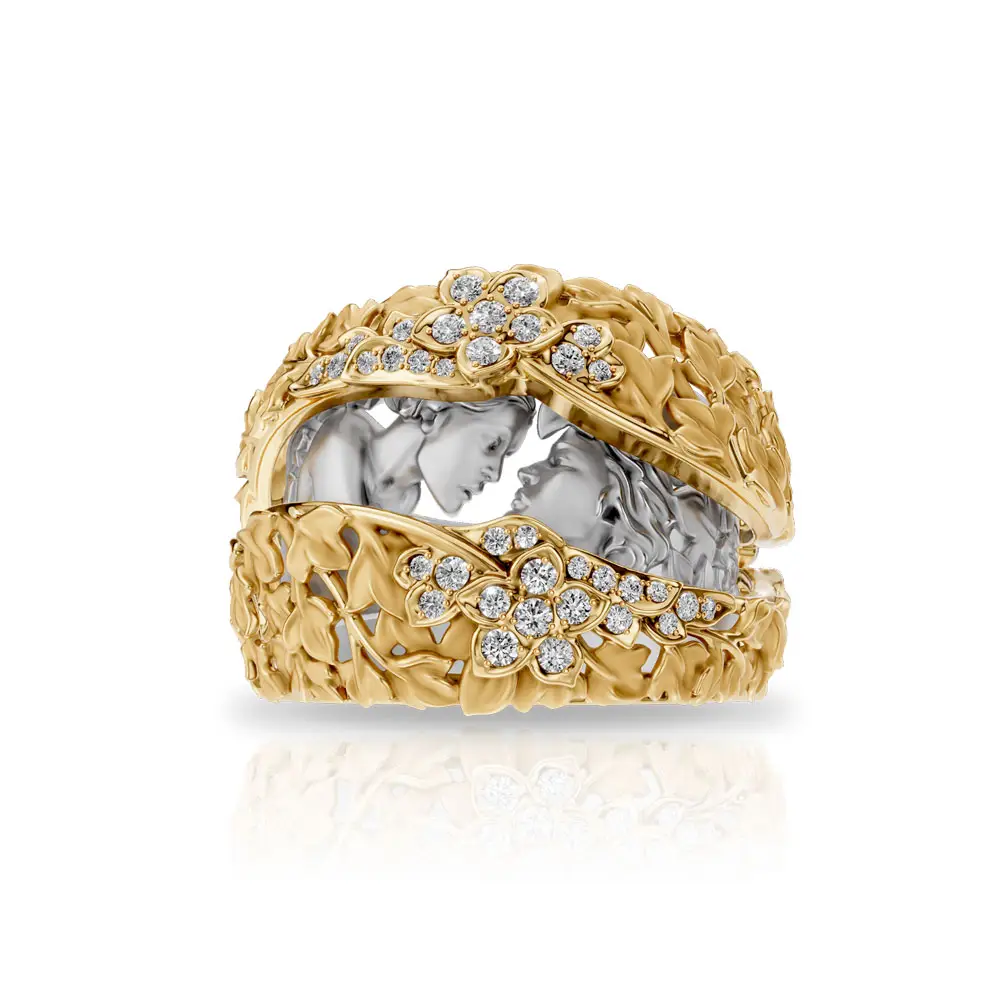 Der raffinierte Öffnungsmechanismus offenbart jedoch das Kostbarste: eine intime Szene von Liebenden, die mit unglaublicher Zartheit und emotionaler Tiefe in das Innere des Rings eingraviert ist. Diese verborgene Szene ist ein Fest der Liebe, der Leidenschaft und der Verbindung zwischen zwei Seelen, dargestellt mit der typischen skulpturalen Perfektion von Carrera y Carrera.