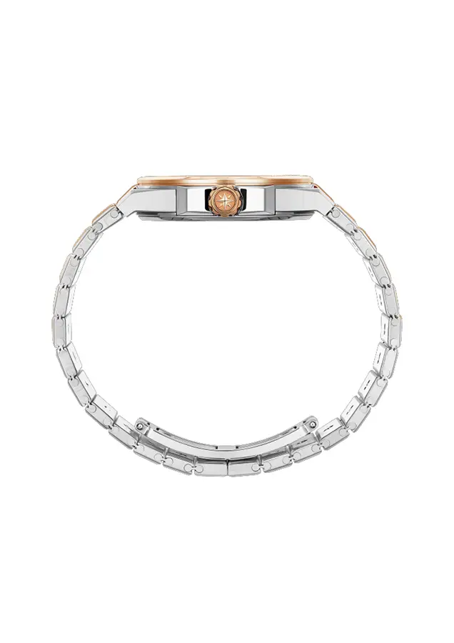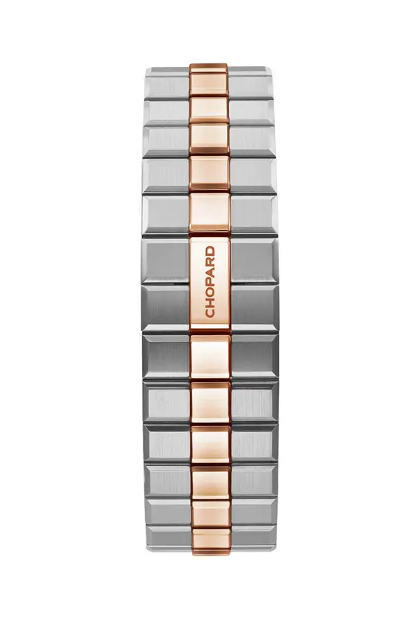 Das 41-mm-Gehäuse kombiniert Edelstahl mit edlem 18-karätigem Roségold zu einem ausdrucksstarken Bicolor-Look. Dieser Kontrast setzt sich im Bicolor-Armband mit praktischer Faltschließe fort.