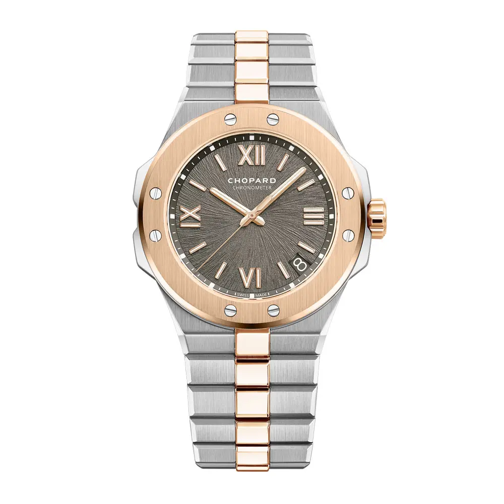 Die Roségold-Lünette rahmt ein graues Zifferblatt, dessen Textur an alpine Gesteinsformationen erinnert. Leuchtzeiger und Indexe sowie eine dezente Datumsanzeige sorgen für optimale Funktionalität und Eleganz.