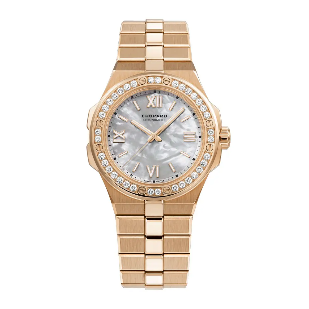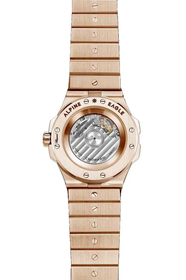 Die Chopard Alpine Eagle Small 295370-5002 vereint Kraft und Anmut in einem Design, das der alpinen Natur gewidmet ist. Ein 36 mm Gehäuse aus 18-karätigem Roségold mit diamantbesetzter Lünette verleiht dieser Uhr eine funkelnde Noblesse bei gleichzeitig eleganter Zurückhaltung.