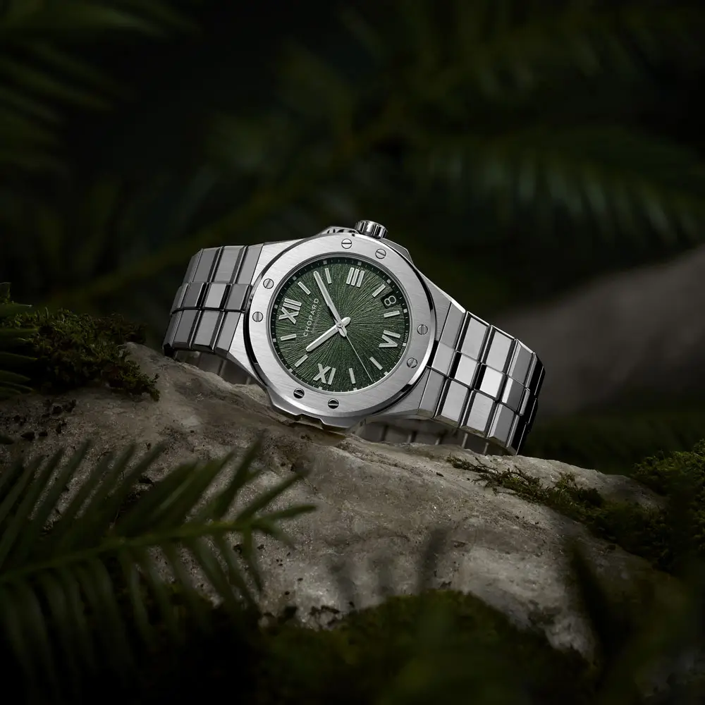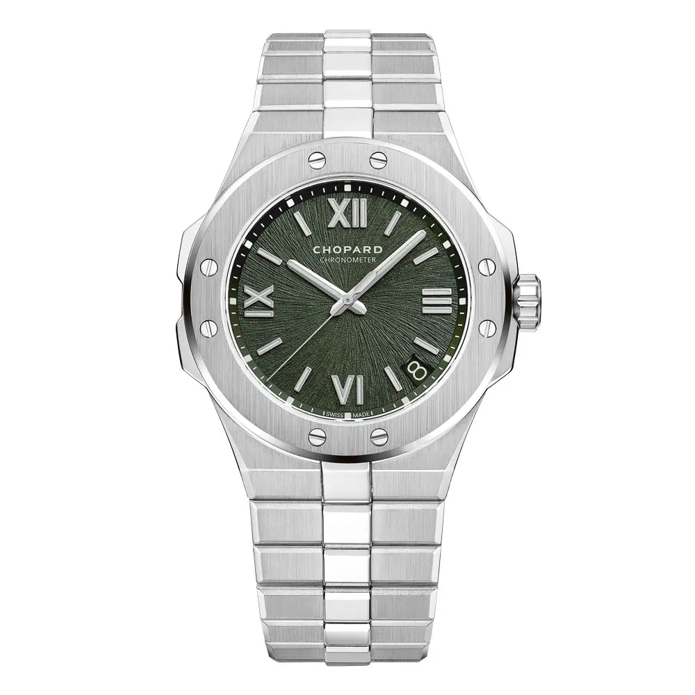 Chopard Alpine Eagle 298600-3014 verkörpert eine moderne Interpretation luxuriöser sportlich-eleganter Uhrmacherkunst, inspiriert von der Kraft und Reinheit der Alpenlandschaft. Gehäuse und integriertes Armband aus exklusivem Lucent Steel™ überzeugen durch außergewöhnliche Robustheit, hohen Glanz und dauerhafte Widerstandsfähigkeit. Das markante Zifferblatt in einem tiefen Tannengrün mit feiner, an die Iris eines Adlers erinnernder Struktur wird durch ausdrucksstarke römische Ziffern und präzise gefertigte Indizes ergänzt.