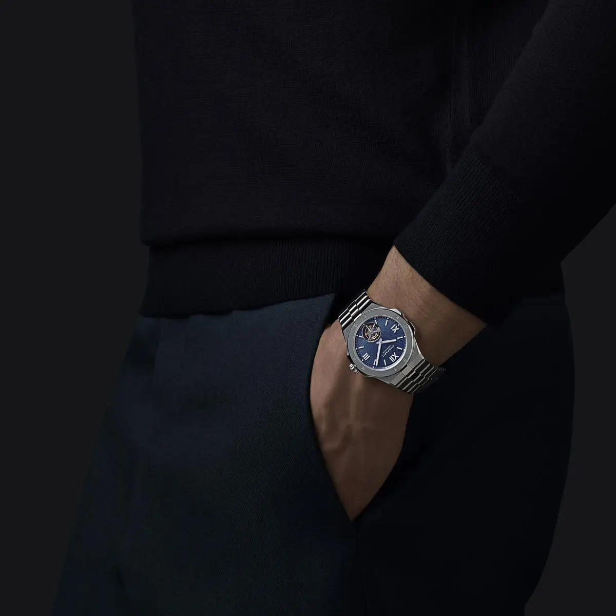 Das runde Gehäuse mit 41 mm Durchmesser vereint sportliche Kraft mit klassischer Ästhetik. Das entspiegelte Saphirglas schützt das strukturierte blaue Zifferblatt, das an alpine Gletscherseen erinnert.