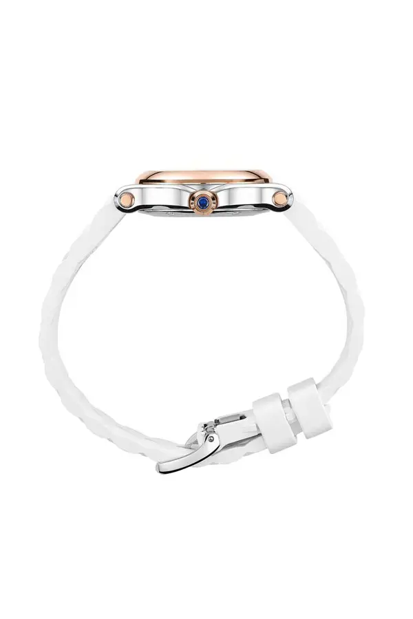 Das weiße Kautschukarmband verleiht der Uhr sportlichen Charakter und angenehmen Tragekomfort, während die Dornschließe für sicheren Halt sorgt. Im Inneren arbeitet ein präzises Quarzwerk, das eine zuverlässige Zeitangabe garantiert.