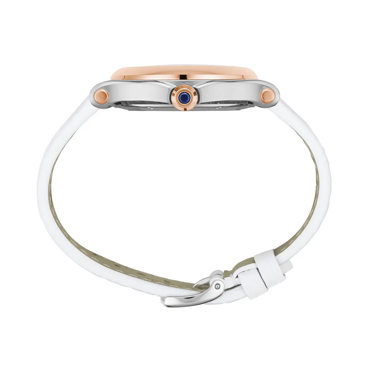 Das runde 36-mm-Gehäuse besteht aus poliertem Edelstahl und wird von einer Lünette aus 18-karätigem Roségold umrahmt – eine Kombination aus Zartheit und Ausdruckskraft. Saphirglas schützt das Zifferblatt, während die Wasserdichtigkeit von 3ATM / 30M ideal für den Alltag ist.