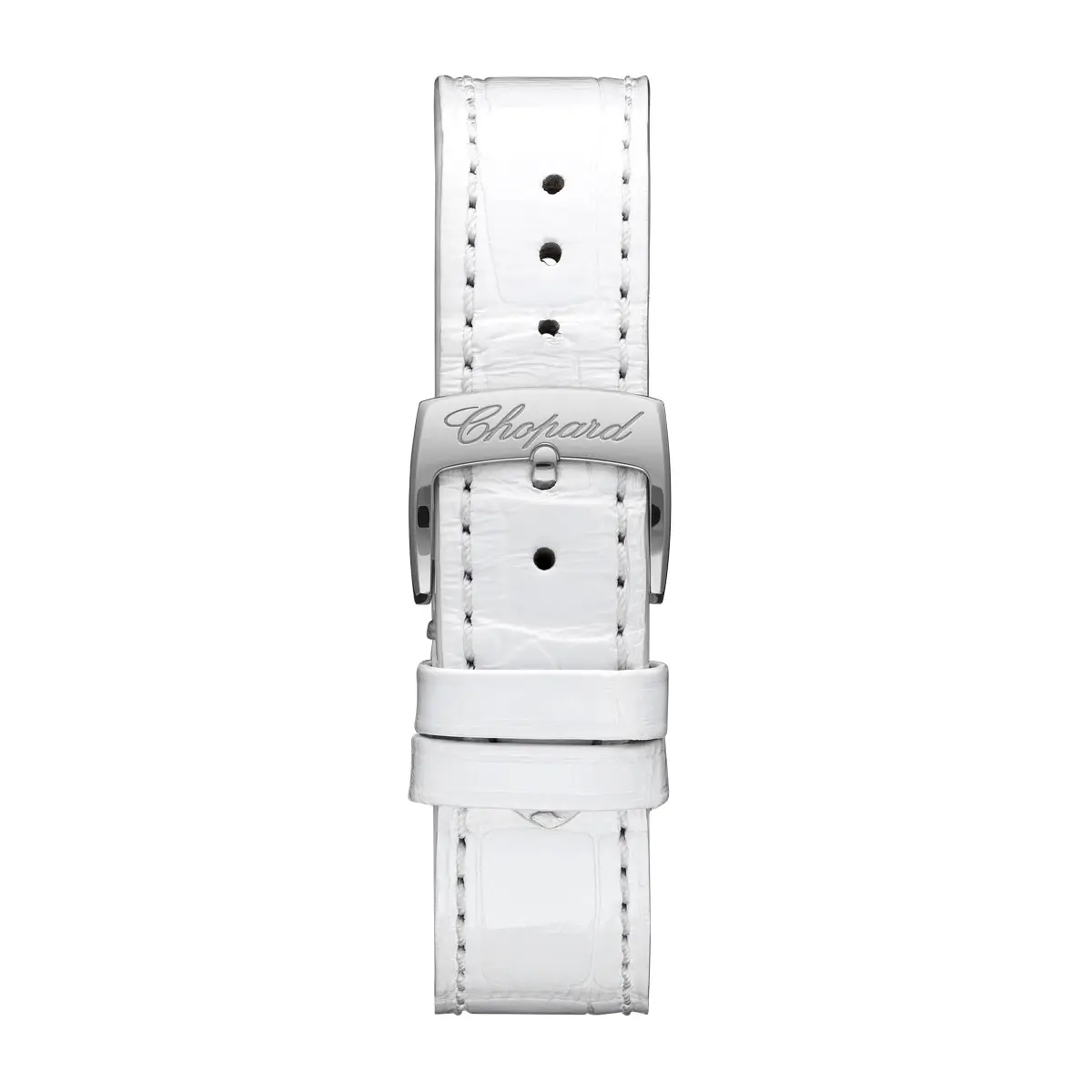 Das weiße Alligatorlederarmband unterstreicht das reine Design und bildet einen stilvollen Kontrast zum warmen Gold. Die Dornschließe sorgt für sicheren Halt im klassischen Stil.