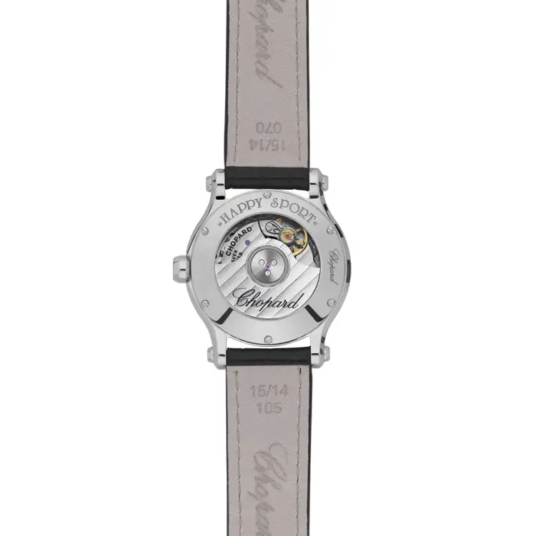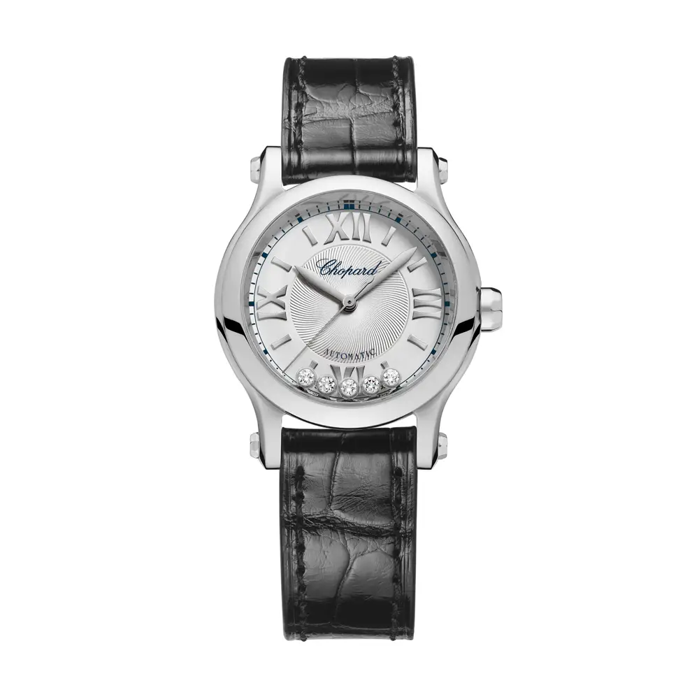 Das 30 mm polierte Edelstahlgehäuse wirkt zart, aber selbstbewusst. Kratzfestes Saphirglas schützt das elegante Zifferblatt, während 30 m Wasserdichtigkeit Alltagstauglichkeit bietet. Auf dem silberfarbenen Zifferblatt tanzen frei bewegliche Diamanten zwischen zwei Saphirgläsern – ein faszinierendes Spiel des Lichts und das Markenzeichen der Happy Sport-Kollektion.