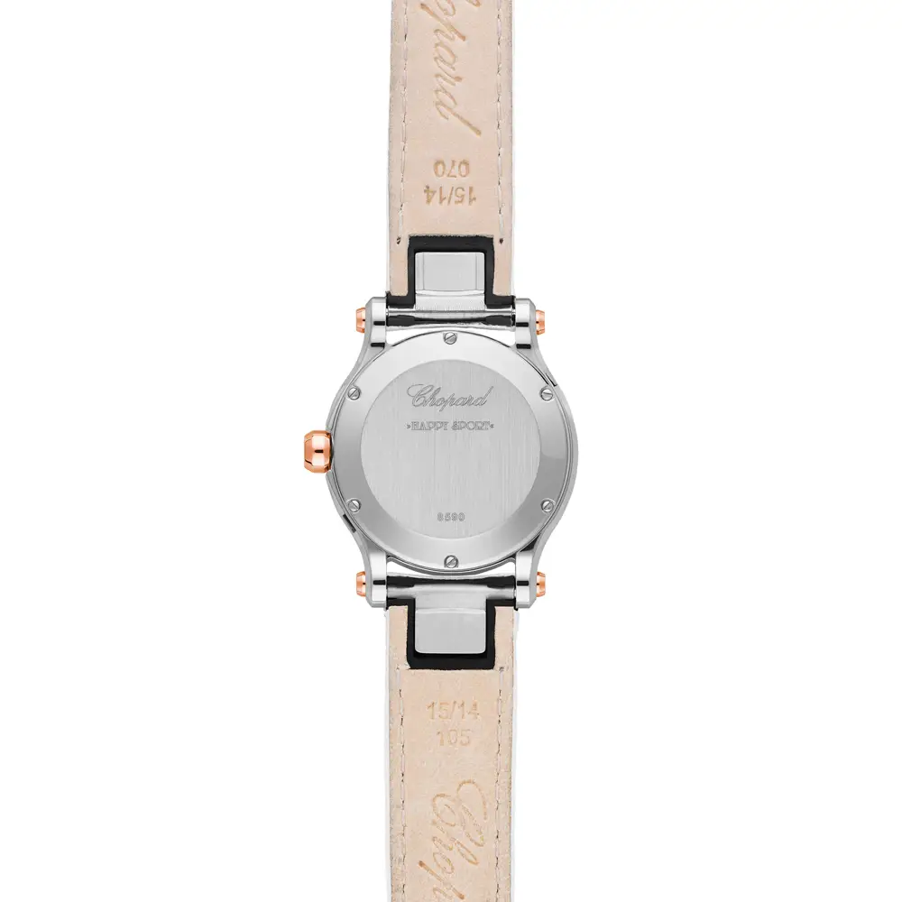 Die Chopard Happy Sport 278590-6005 verkörpert feminine Feinheit, Liebe zum Detail und moderne Eleganz. Das runde 30-mm-Gehäuse aus Edelstahl und 18-karätigem Roségold schafft einen stilvollen Kontrast zwischen kühler Brillanz und warmem Goldschimmer.