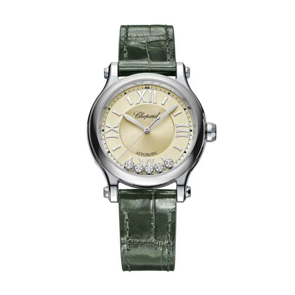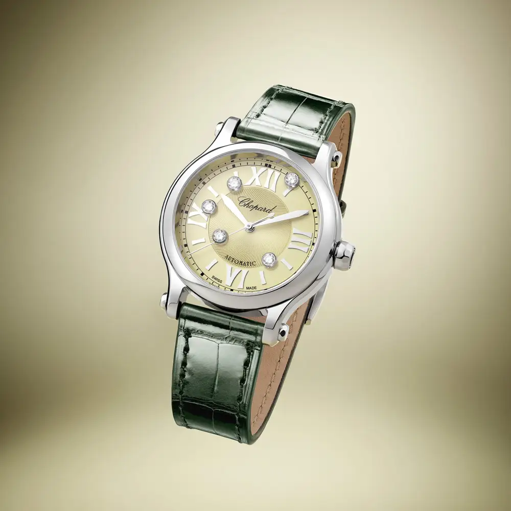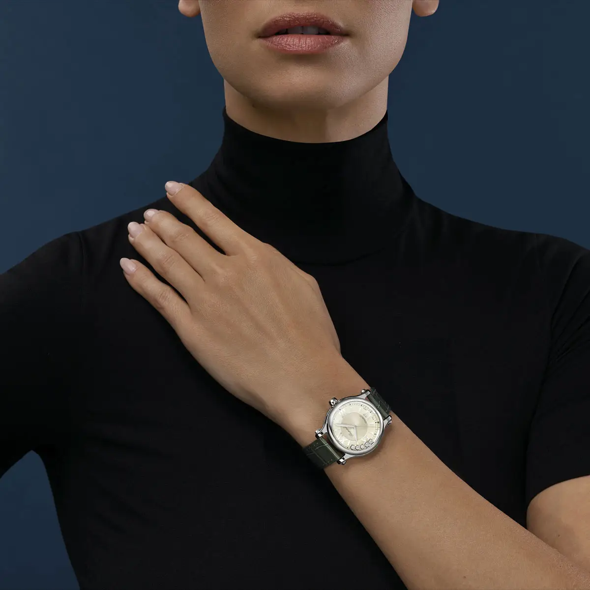 Das elfenbeinfarbene Zifferblatt wird von frei beweglichen Diamanten geschmückt, die zwischen zwei Saphirgläsern schweben und bei jeder Bewegung ein zartes Lichtspiel erzeugen. Dieses charakteristische Merkmal der Happy Sport-Kollektion steht für Freiheit, Lebensfreude und feminine Raffinesse.
