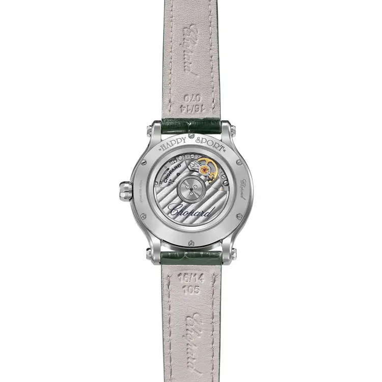 Im Inneren arbeitet das Automatikwerk CHOPARD 09.01-C mit 42 Stunden Gangreserve, das Präzision und Zuverlässigkeit garantiert. Das grüne Alligatorlederarmband setzt einen mutigen, doch eleganten Akzent. Die Chopard Happy Sport 278608-3010 ist mehr als eine Uhr – sie ist ein Schmuckstück, das Selbstbewusstsein und feminine Stärke verkörpert.
