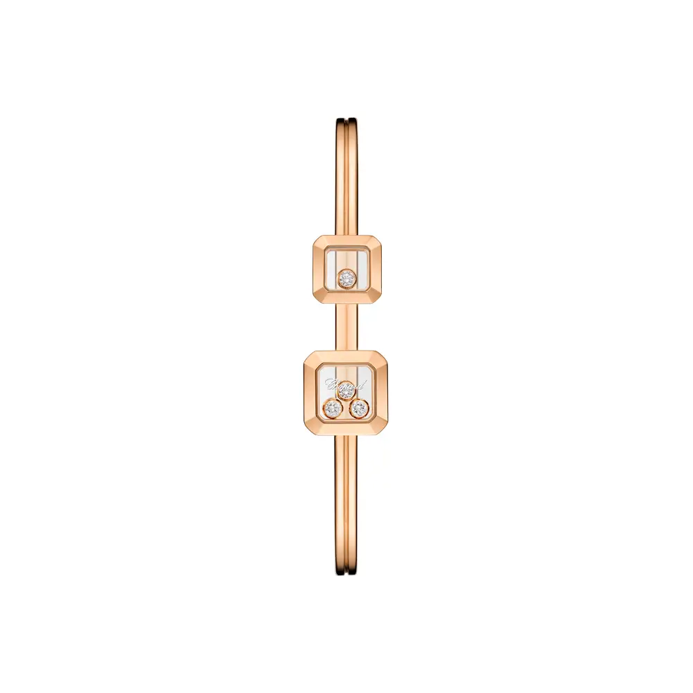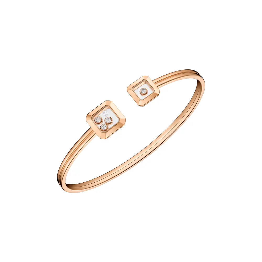 Die Armspange ist mit vier Diamanten von insgesamt 0,20 Karat besetzt, präzise gefasst, um ihr funkelndes Spiel perfekt zur Geltung zu bringen. Dieses außergewöhnliche Design unterstreicht Chopards meisterhafte Handwerkskunst und die Philosophie der joie de vivre – die Freude an jedem Moment.
