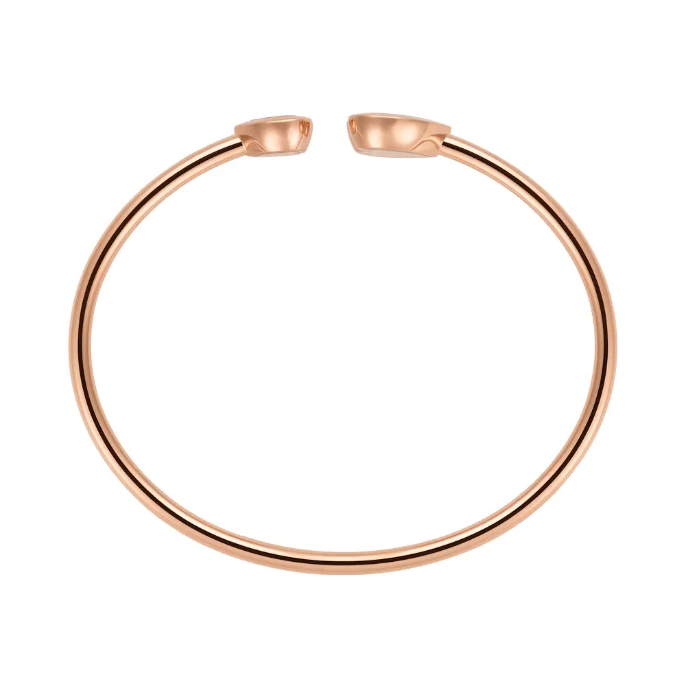 Gefertigt aus 18 Karat ethischem Roségold, ist das Armband mit zwei Herzmotiven verziert, von denen eines drei frei bewegliche Diamanten (0,15 ct) unter einem Saphirglas birgt. Das offene „Cuff“-Design sorgt für eleganten Tragekomfort, während die Diamanten bei jeder Bewegung tanzen – ein Sinnbild für Freude und Freiheit.