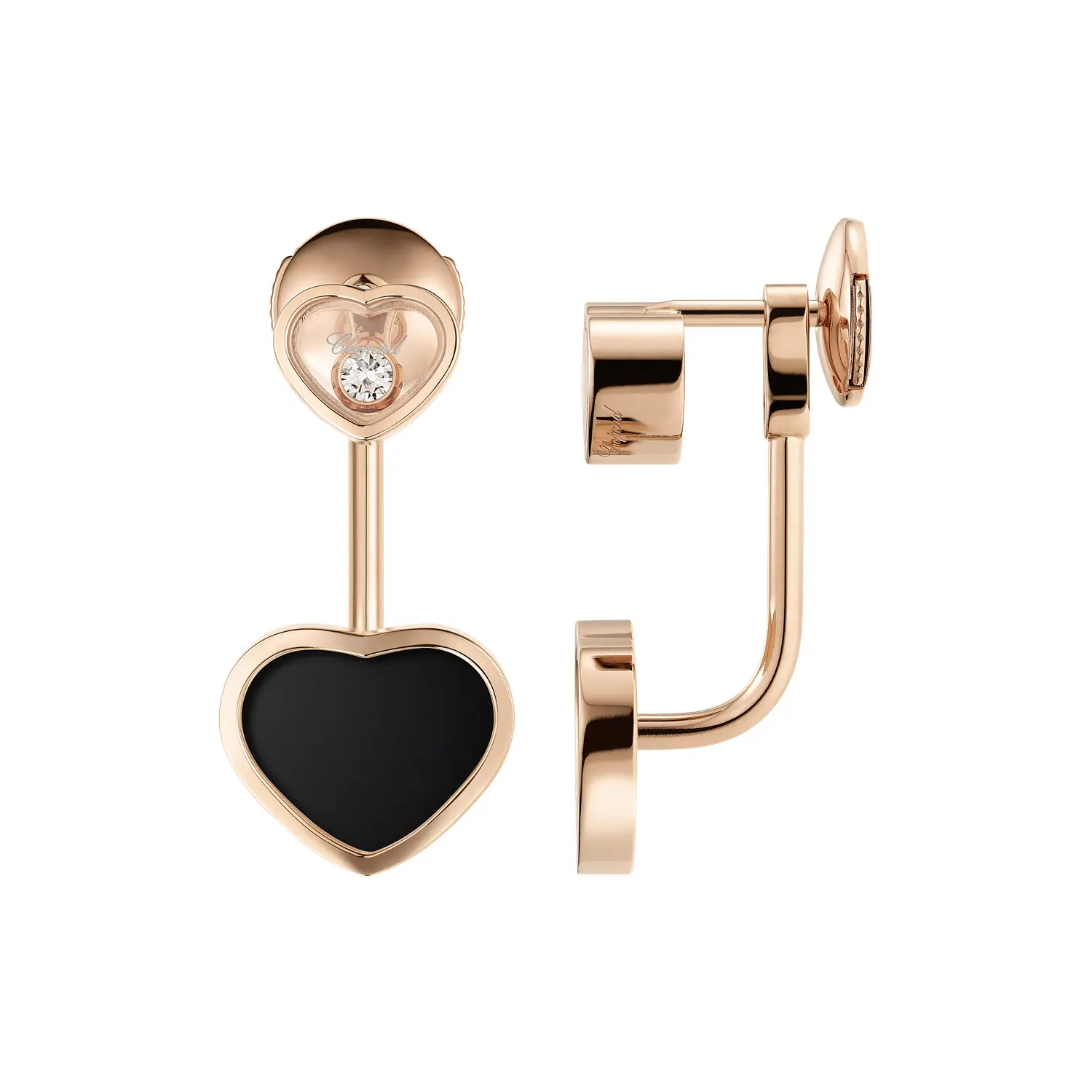 Die Chopard Happy Hearts 83A082-5201 Ohrringe verkörpern die perfekte Balance aus Eleganz, Kontrast und ikonischem Stil der Marke. Gefertigt aus 18 Karat ethischem Roségold, sind sie mit Onyx-Herzen und Brillanten (insgesamt ca. 0,10 ct) geschmückt, die anmutig zwischen zwei Saphirgläsern tanzen – ein charakteristisches Merkmal der Happy Hearts Kollektion.