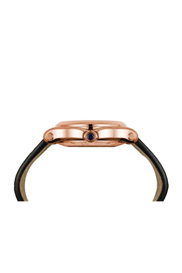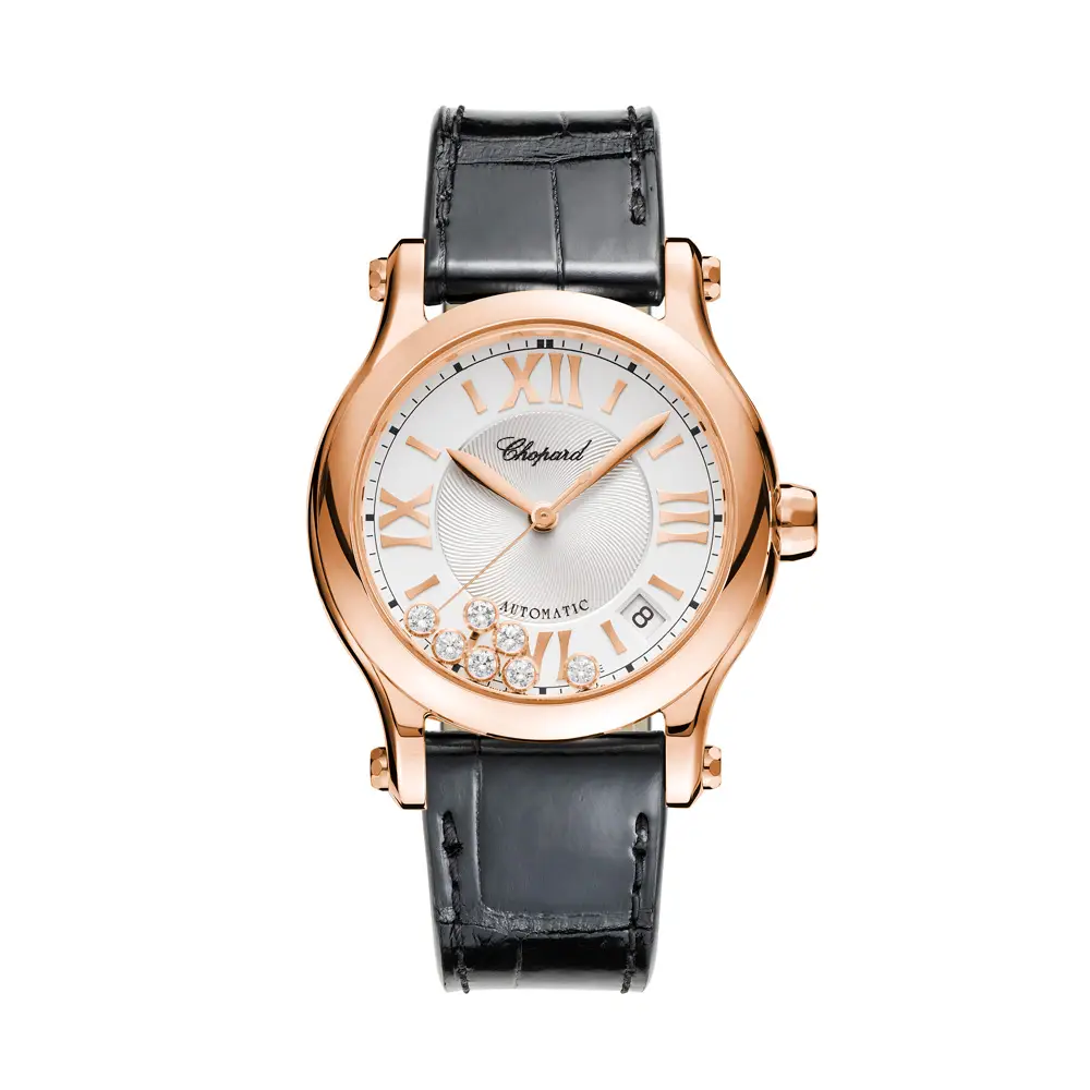 Das runde 36-mm-Gehäuse besteht aus edlem 18kt Roségold, dessen warmer Glanz die Eleganz der Uhr unterstreicht. Eine Lünette aus Roségold umrahmt das silberfarbene Zifferblatt, auf dem frei bewegliche Diamanten tanzen – ein lebendiges Symbol für Freude und Bewegung.