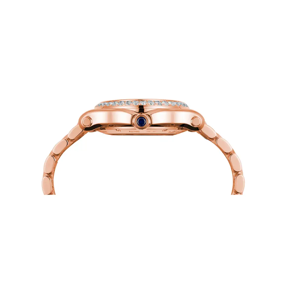 Das 36 mm große runde Gehäuse, die diamantbesetzte Lünette und das integrierte Armband aus Roségold strahlen zeitlose Harmonie aus. Unter dem Saphirglas funkelt ein silberfarbenes Zifferblatt, auf dem bewegliche Diamanten tanzen und jedem Moment Glanz verleihen.