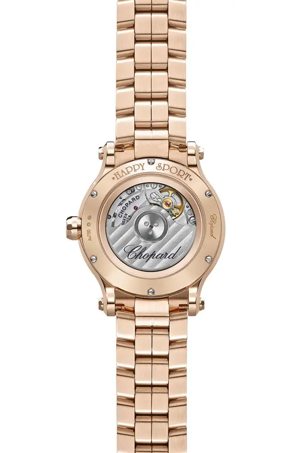Das 33 mm Gehäuse aus 18k Roségold ist mit fünf frei beweglichen Diamanten geschmückt, die zwischen zwei Saphirgläsern tanzen und bei jeder Bewegung des Handgelenks funkeln. Das entspiegelte Saphirglas gewährleistet Robustheit und hervorragende Ablesbarkeit, während das Automatikwerk CHOPARD 09.01-C eine Gangreserve von 42 Stunden und höchste Präzision bietet.